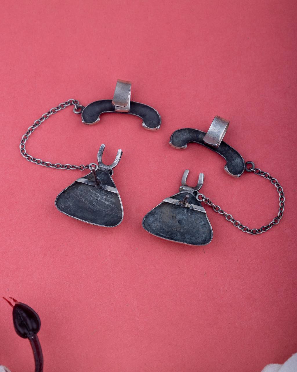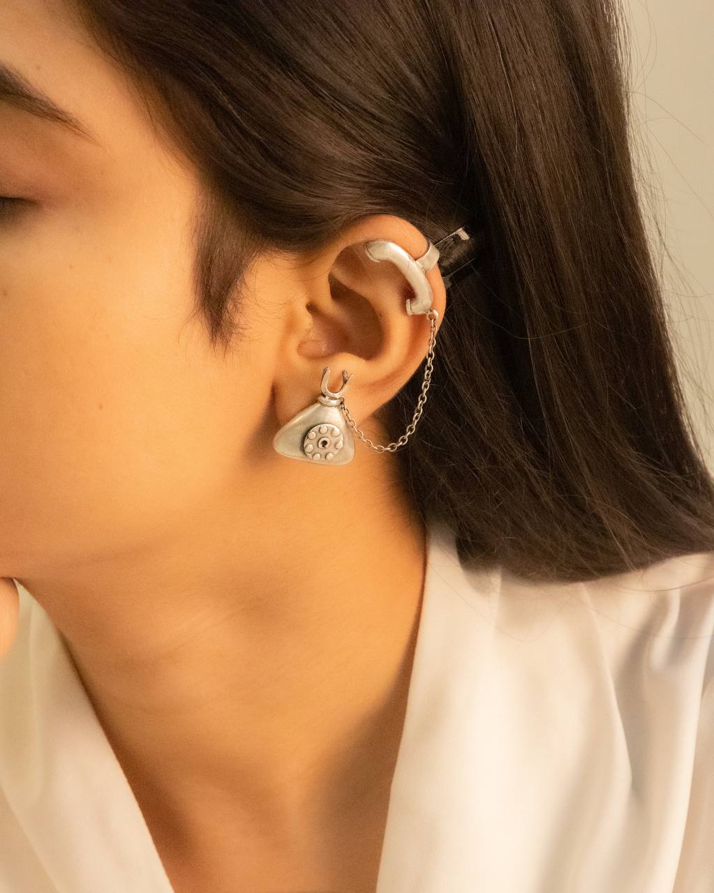 Step back in time with a quirky twist with our Mizoya Vintage Inspired Telephone Earcuff, a playful and uniquely designed piece that celebrates nostalgia. This captivating silver ear cuff and drop earring set is meticulously handcrafted from genuine 92.5 sterling silver, ensuring both artistic beauty and exceptional quality. The set features a miniature, intricately detailed rotary telephone design as the main drop earring, complete with the classic receiver and a textured dial pad. A delicate chain elegantly connects the receiver to a simple yet stylish ear cuff that gracefully embraces the upper helix, adding a touch of contemporary flair to the vintage charm. The oxidized finish lends these designer silver earrings an authentic, antique allure, highlighting their quirky details and making them a true conversation starter.