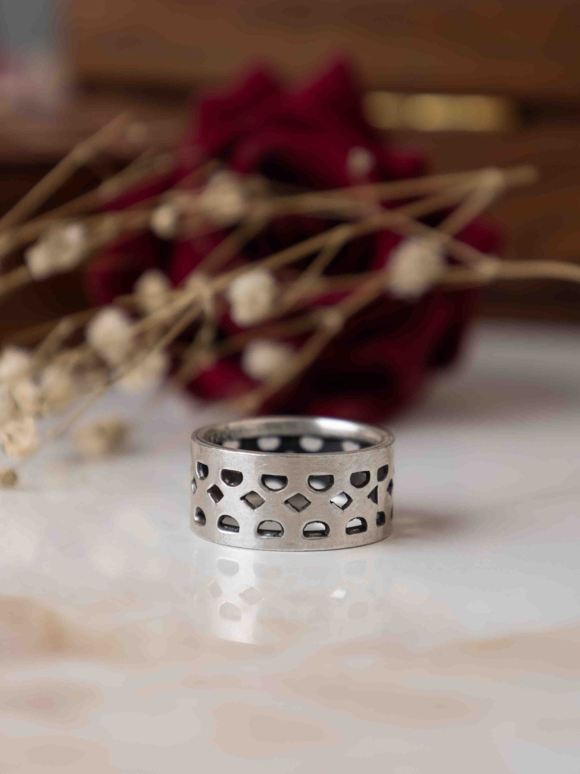 Elevate your style with the Moh Fine Carved Band Ring, featuring an intricate cut-out design with geometric patterns. This sleek, lightweight ring offers a modern twist on classic craftsmanship.