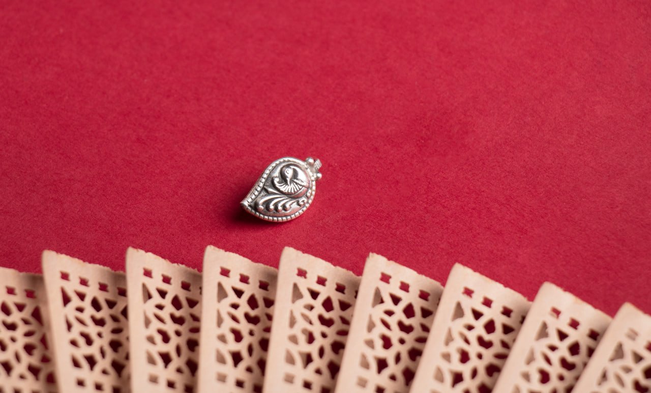 Crafted in 92.5 sterling silver with a 92.5 purity stamp, the Moh Peacock Embossed Carry Motif Nose Clip-On features a striking design with an embossed peacock motif and intricate carry-inspired detailing, accented with a central gemstone. Its elaborate craftsmanship and elegant finish make it a standout piece for women’s fashion jewelry. Perfect for wedding jewelry, elegant accessories, and handcrafted silver pieces, this premium silver nose clip adds a touch of royal charm to any outfit, ideal for festive celebrations and cultural events.
