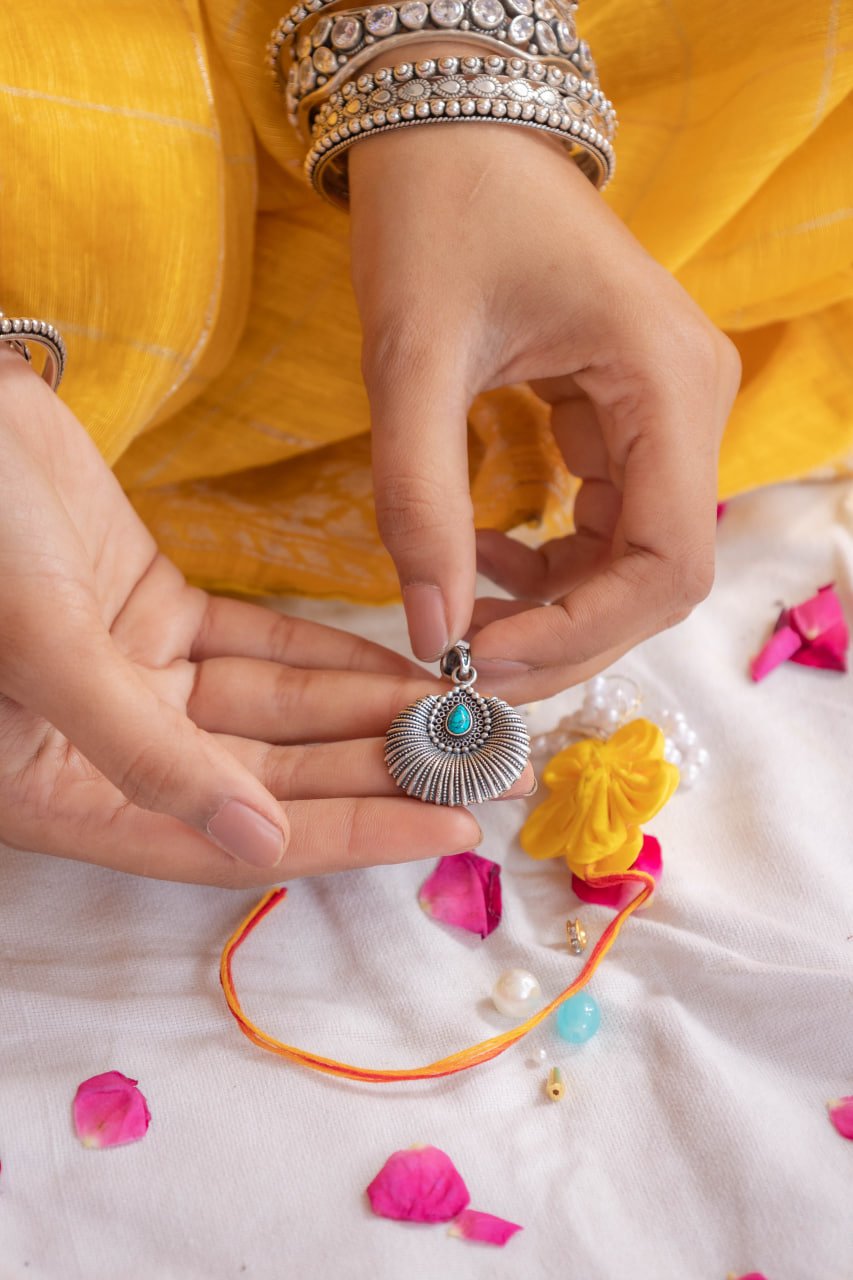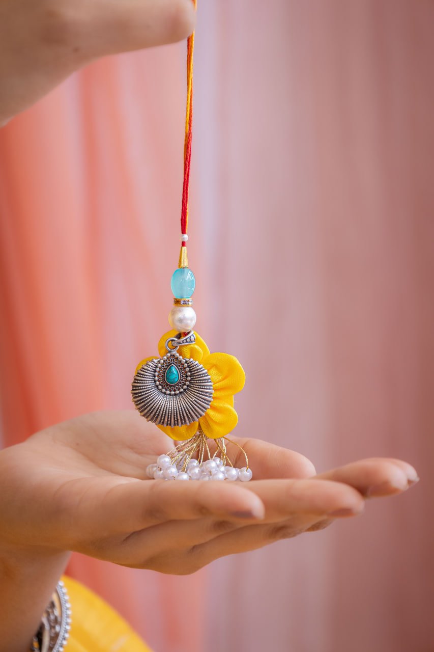 Our Moh Sea Shell Pendant Blooming Lumba Rakhi captures oceanic elegance and transforms it into a beautiful celebration that honours the flowing grace found in the special nanad-bhabhi relationship, like the eternal rhythm of chuda ceremonies.