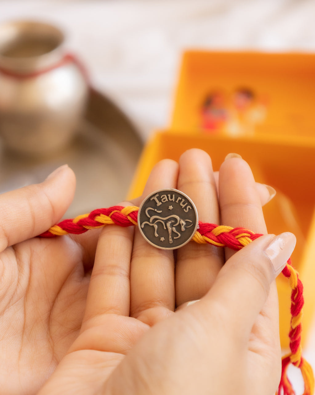Our Moh Taurus Sun Sign Brooch Rakhi captures the bull's steady energy and transforms it into a beautiful celebration that honours the deep bond found in siblings.