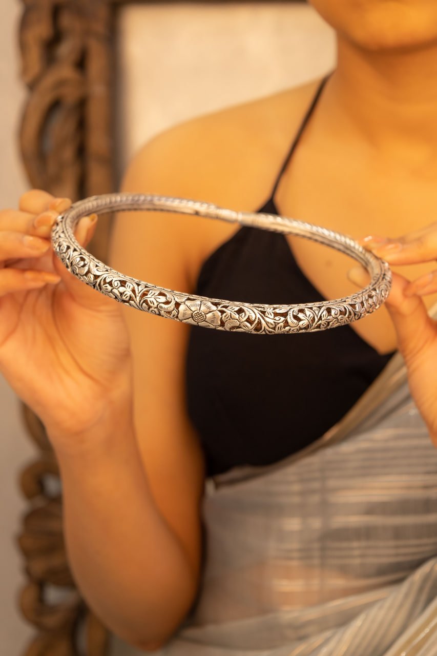 "Tattva" representing the fundamental essence of beauty, this hasli embodies the pure artistry of Indian metalwork where every petal and leaf tells a story of heritage, skill, and timeless elegance.Our exquisite Tattva hasli celebrates the ancient art of chitai carving, featuring an unbroken chain of intricate floral motifs that flow seamlessly around your neckline like a garland of silver blossoms.