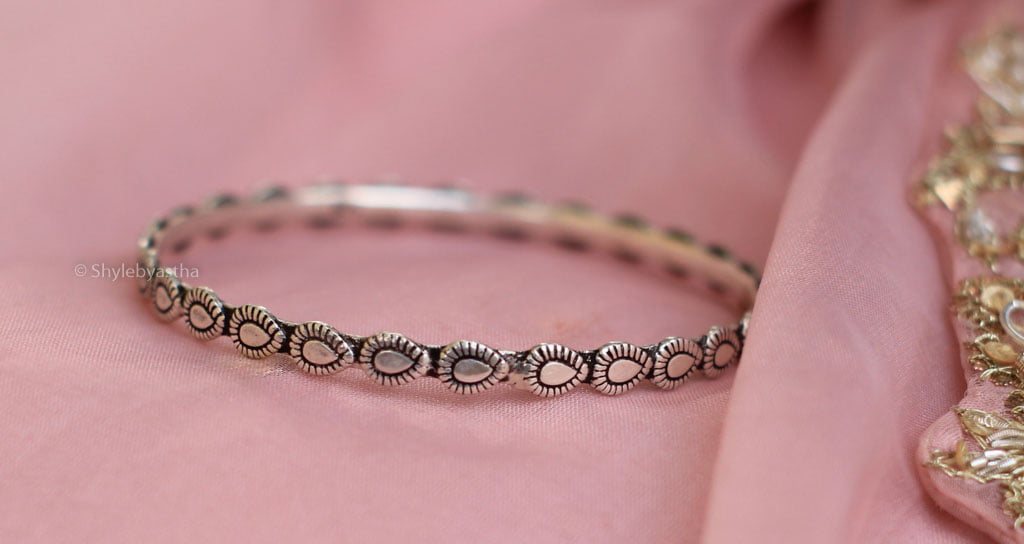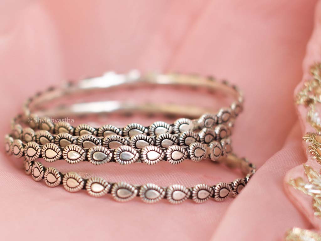 Elevate your elegance with the Adya Fine Drop Bangle, where delicate artistry meets timeless sophistication. This exquisite set of fine bangles features intricate teardrop motifs that cascade gracefully around your wrist like morning dewdrops caught in silver light. Each bangle showcases meticulous detailing with raised droplet patterns and fine beadwork that creates a mesmerizing textural symphony. The slender profile and refined craftsmanship make these bangles perfect for stacking, allowing you to create your own personalized arm story with layers of luminous beauty.