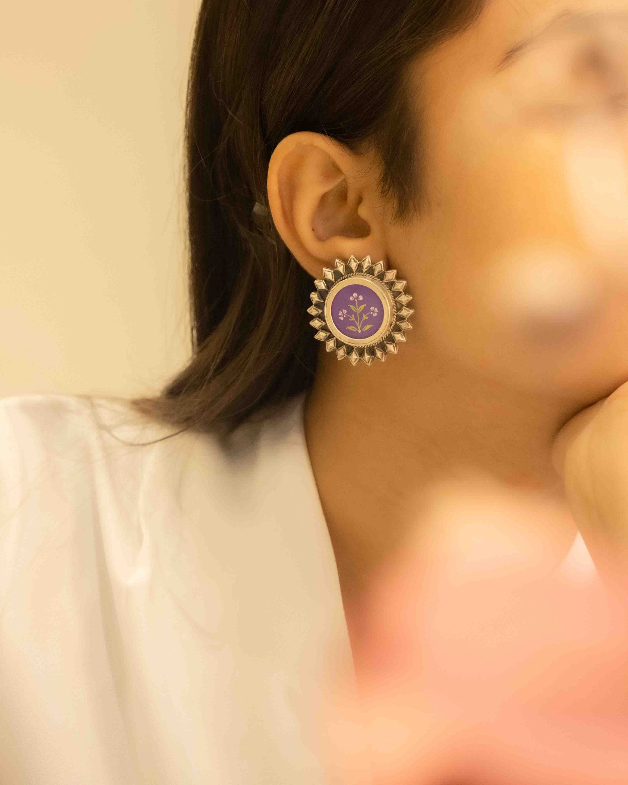 The Adya Floral Painted Intricate Stud Earring features a detailed floral painted design with a polished silver finish, crafted through masterful handcrafted techniques using 92.5 silver. Inspired by the timeless elegance of traditional Indian jewelry, each element blends intricate artistry with enduring strength, creating a piece that feels both classic and sophisticated.