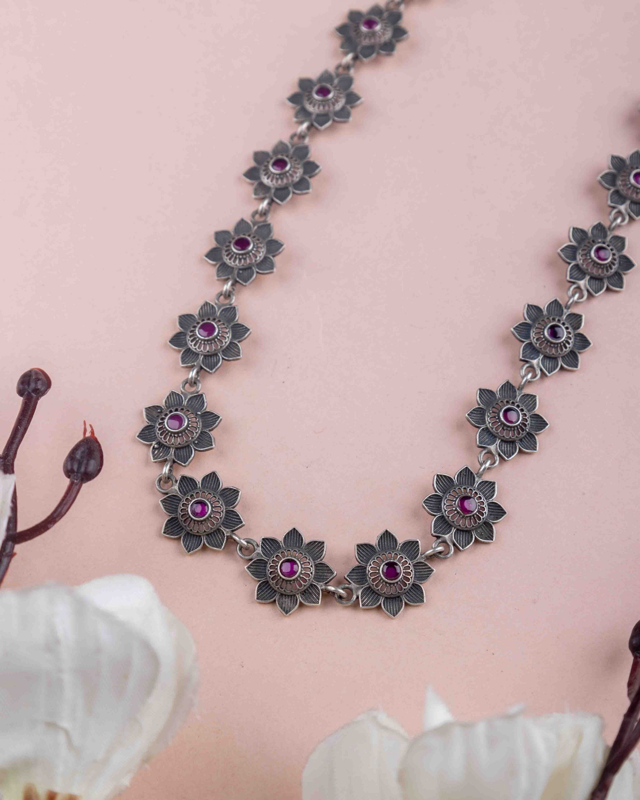 Our Adya Intricate Flower Versatile Necklace Set is botanical elegance redefined, featuring delicate floral motifs that bloom continuously around your neckline like an eternal garden of metallic blossoms crafted with exquisite detail.