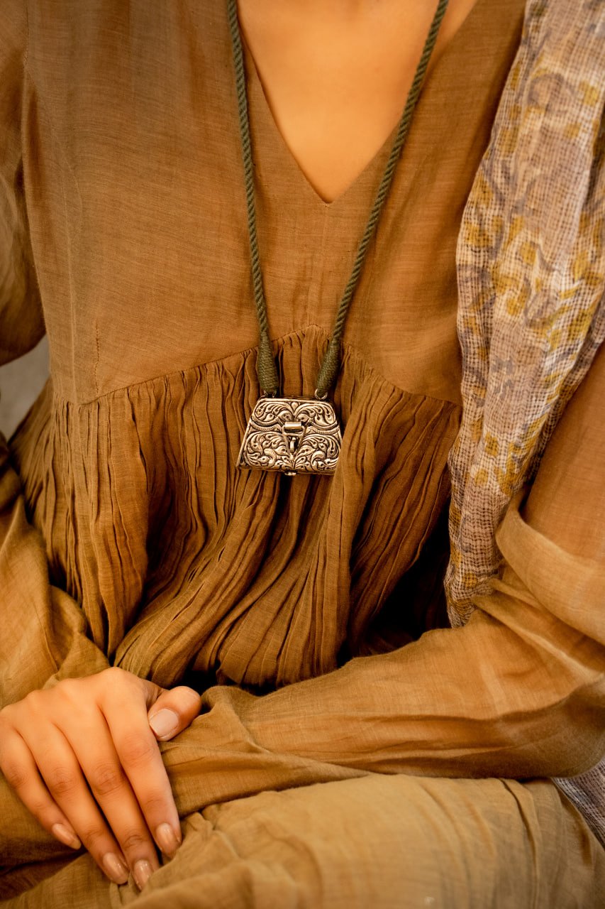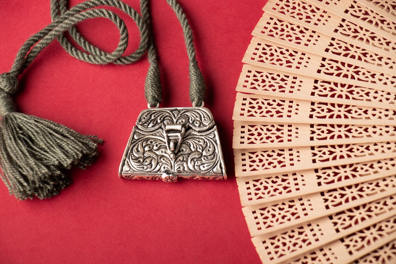 The centerpiece of this necklace is a beautifully detailed pendant, designed to resemble a miniature vintage purse. It is exquisitely adorned with intricate "chitai" (chasing/embossing) work, showcasing traditional patterns that evoke a sense of bygone elegance. This charming pendant is suspended from a comfortable and stylish green dori (adjustable thread), which adds a vibrant pop of color and ensures a perfect fit. The oxidized finish lends this designer silver necklace an authentic, antique charm, highlighting every intricate detail and making it a distinctive statement piece for any lover of unique, handcrafted jewelry.