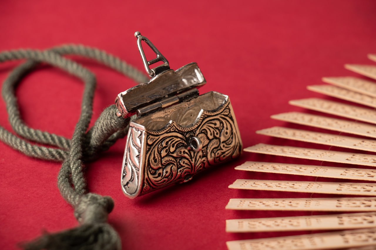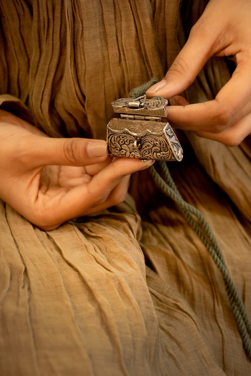 Carry a piece of history with our Adya Vintage Inspired Chitai Purse Green Dori Necklace. This unique silver necklace is meticulously handcrafted from genuine 92.5 sterling silver, ensuring both exceptional quality and a charming, nostalgic allure.