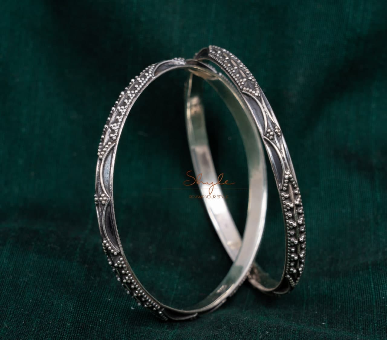 Discover the art of layered luxury with the Anvaya Daana Detailed Oxidised Bangle, where multiple strands of intricate craftsmanship unite in perfect harmony. This stunning multi-band bangle features delicate oxidised detailing that creates depth and character across each individual strand. The intertwining bands showcase varying textures and patterns, from fine beadwork to elegant rope-like twists, creating a sophisticated symphony of silver that moves gracefully with your every gesture. The darkened oxidised finish adds vintage allure while highlighting the meticulous artistry of each textured element.
