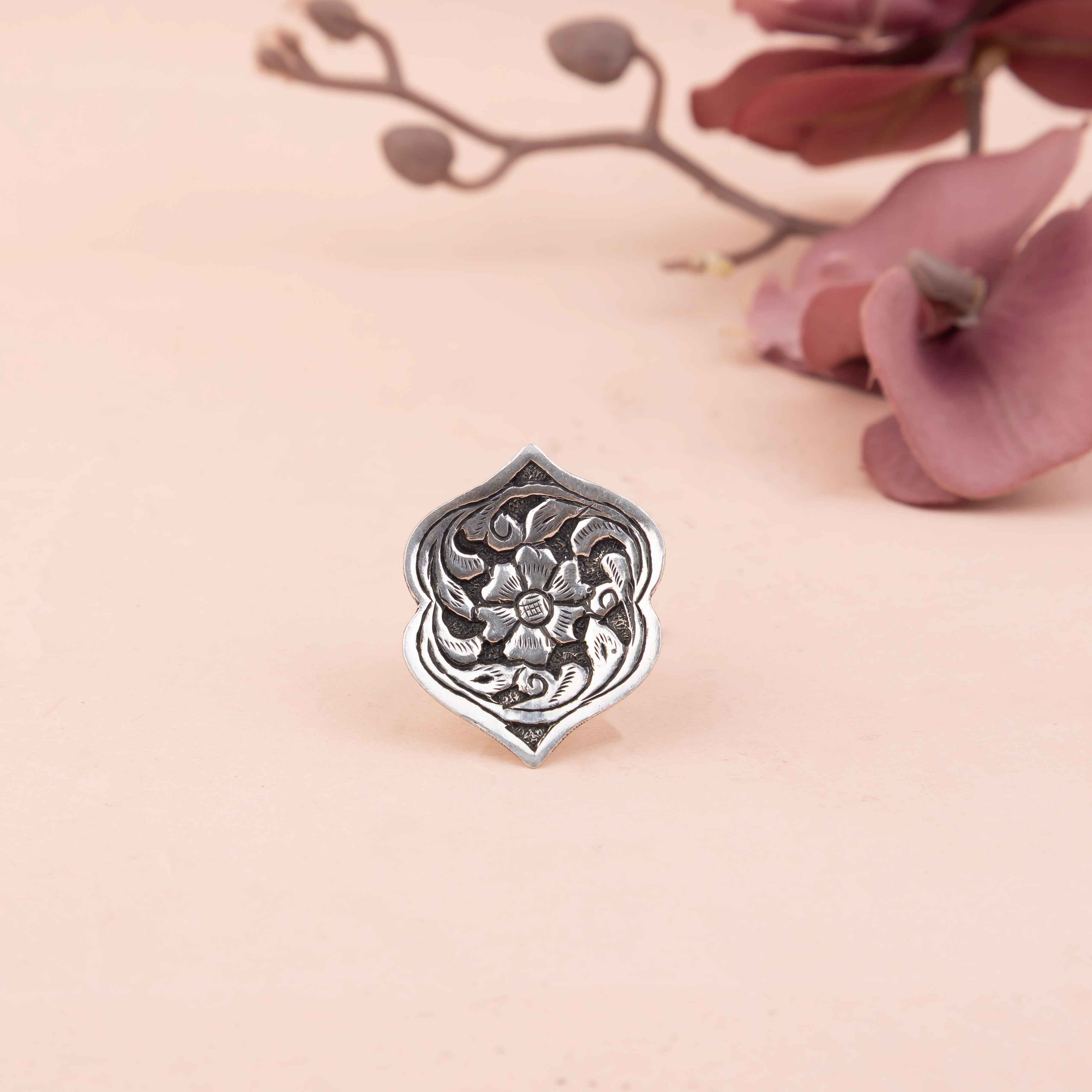Crafted in 92.5 sterling silver with a 92.5 purity stamp, the Anvaya Flora Vintage Inspired Chitai Ring features a stunning circular design with intricate floral carvings and detailed leaf patterns, finished with a vintage patina. Its delicate craftsmanship and nostalgic elegance make it a standout piece for women’s fashion jewelry. Perfect for wedding jewelry, elegant accessories, and handcrafted silver rings, this premium silver ring adds a touch of timeless beauty to any outfit, ideal for festive celebrations and cultural events.