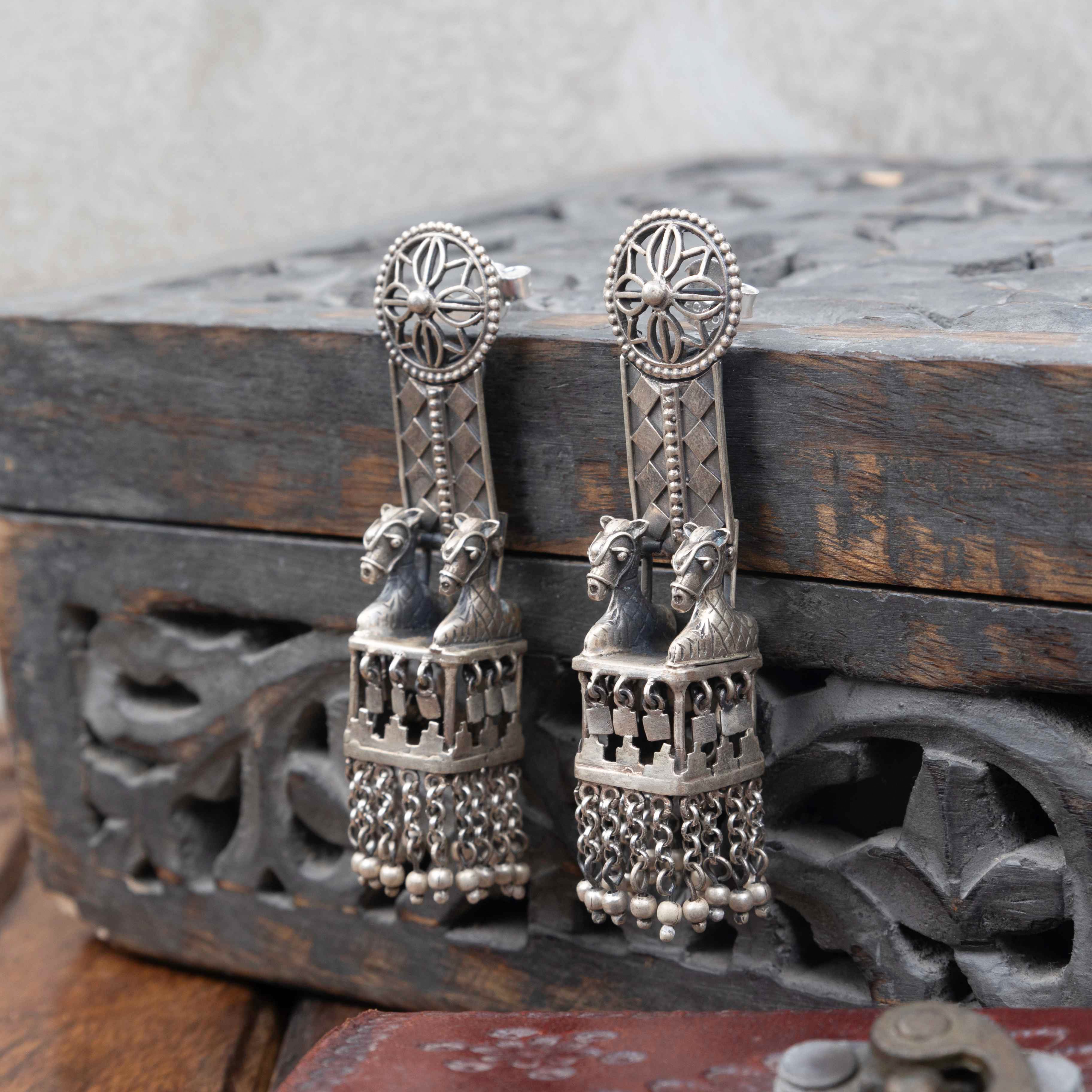 Journey into the realm of ancient grandeur with the Anvaya Horse Rath Statement Jhumka, where mythological storytelling meets extraordinary craftsmanship. These magnificent earrings feature an intricate circular stud top with geometric patterns that gracefully connects to a detailed horse-drawn chariot motif, symbolizing victory, power, and divine protection. The ornate jhumka base showcases elaborate jali work and cascading silver droplets that create melodious movement, while the oxidized finish adds dramatic depth to every sculptural detail. Each piece tells the epic tale of celestial journeys, making these statement earrings perfect for the woman who embraces cultural heritage with regal elegance.
