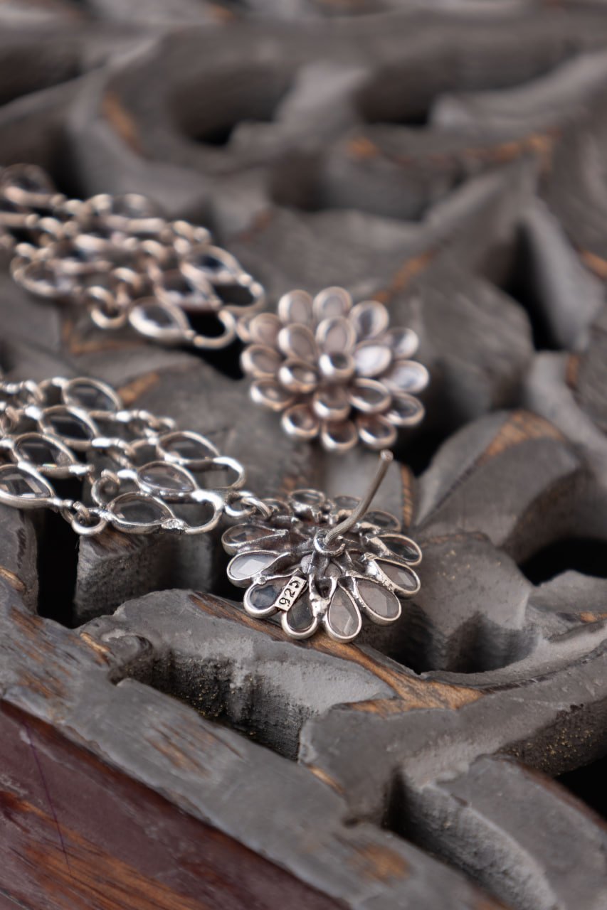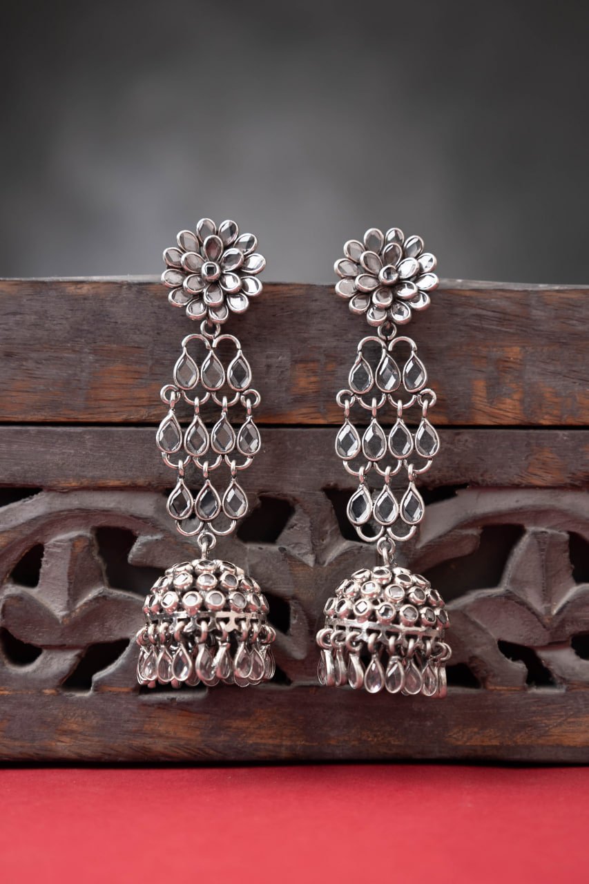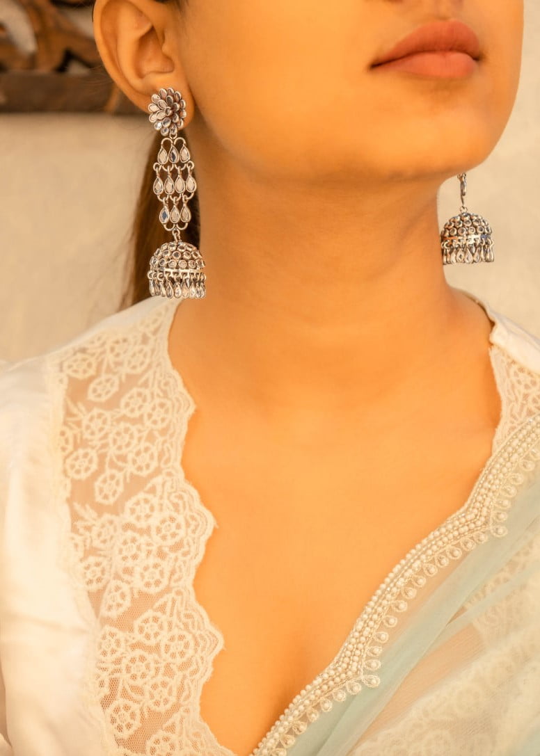 Discover the epitome of traditional splendor with the Essence Fine Scintillating Jhumki, a masterpiece that weaves together generations of artisanal excellence. These magnificent earrings begin with blooming floral studs that cascade into layers of mesmerizing teardrop motifs, each one meticulously crafted to catch and reflect light like morning dew. The journey culminates in classic jhumki bells adorned with delicate droplets that create an enchanting melody with every graceful movement. This three-tiered symphony of silver transforms you into a vision of ethereal beauty, celebrating the timeless allure of Indian heritage jewelry.