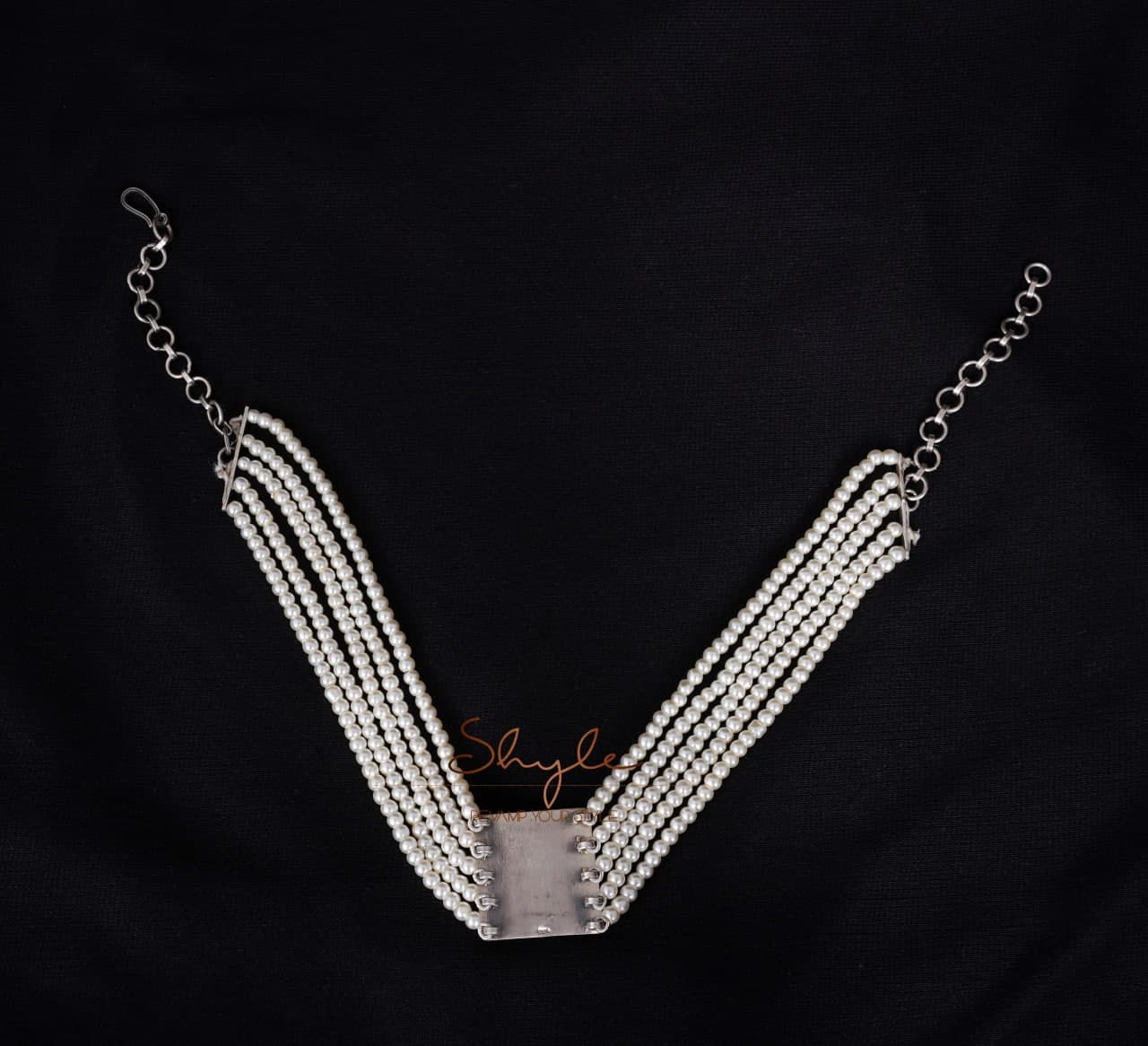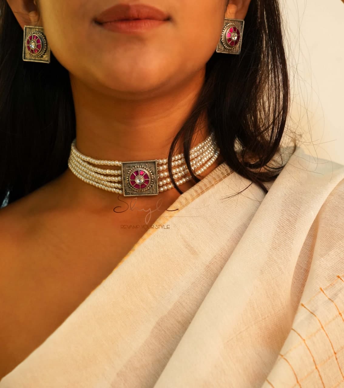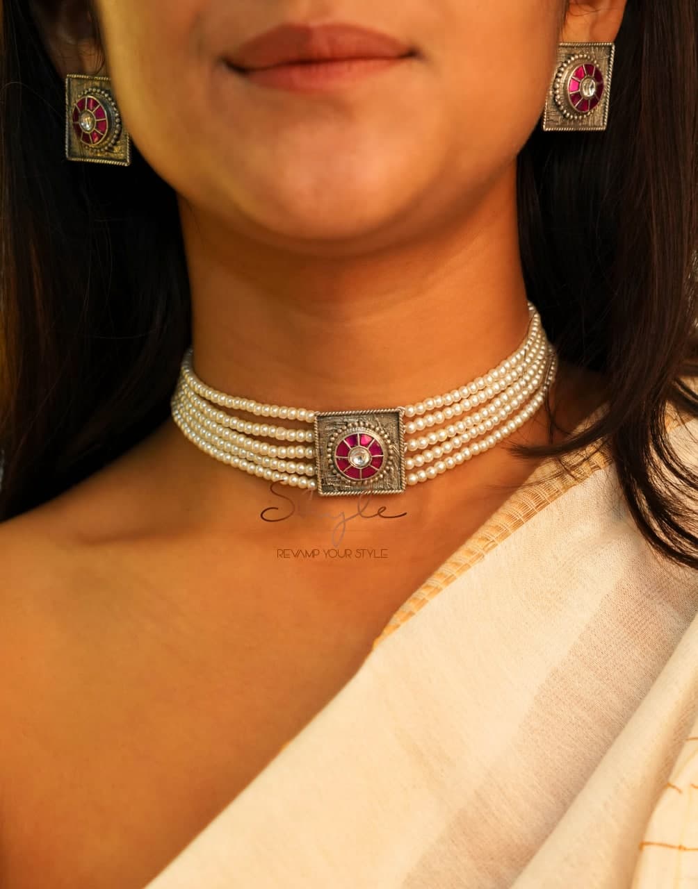 Essence Square Motif Kundan Pearl Statement Choker Set