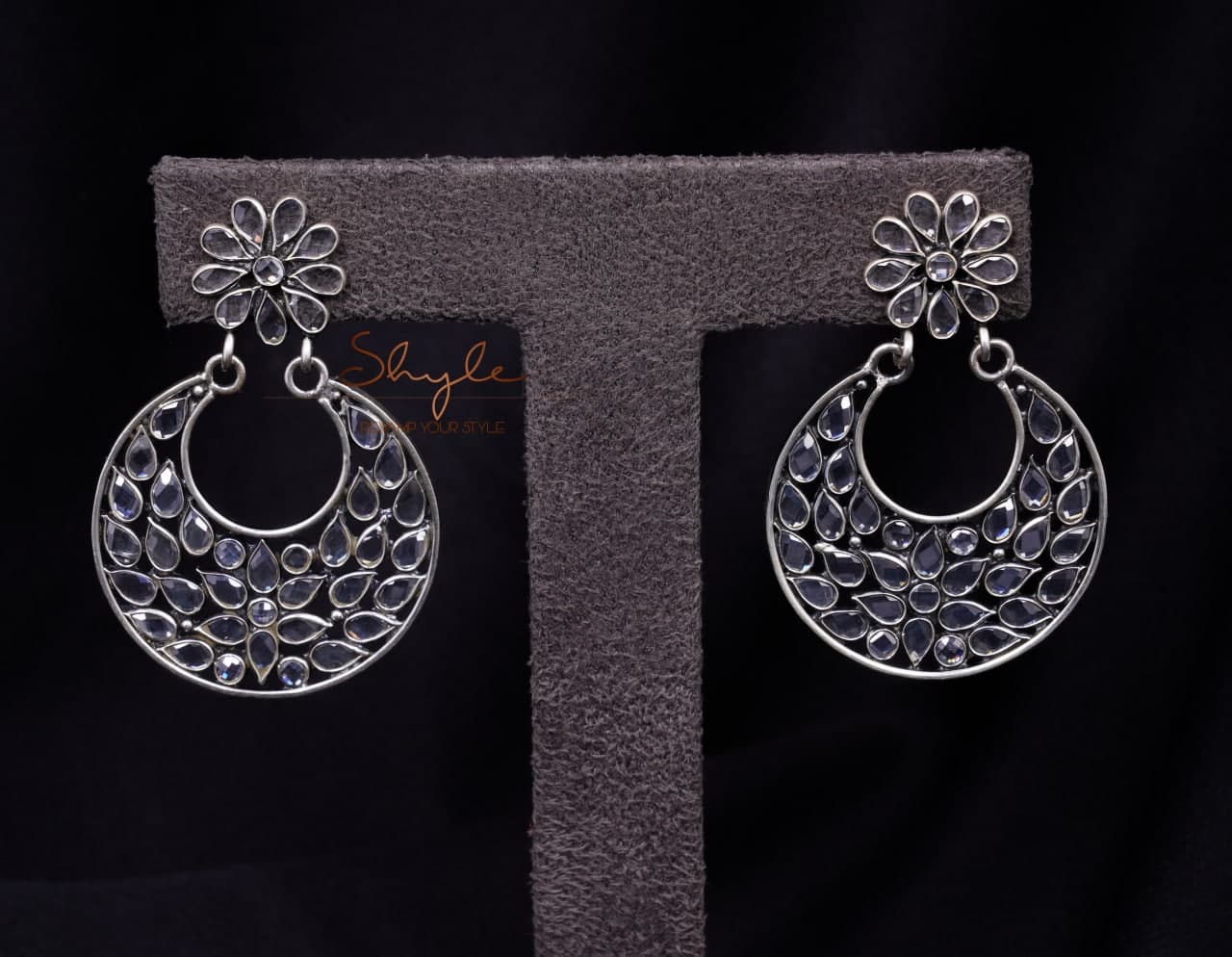 Sparkle with sophisticated grace in our Essence Scintillating Petal Motif Earrings, a dazzling fusion of natural elegance and radiant brilliance. These exquisite silver earrings are meticulously handcrafted from genuine 92.5 sterling silver, ensuring both exceptional quality and a captivating allure. Each earring features a beautifully sculpted stud in a delicate floral or cluster design, from which suspends a circular or crescent moon-shaped drop. This captivating drop is entirely encrusted with shimmering white stones, meticulously set in intricate petal-like patterns that catch and reflect every ray of light, creating a breathtaking display of sparkle. The precise arrangement of these stones mimics the delicate form of blooming petals, adding depth and dimension.