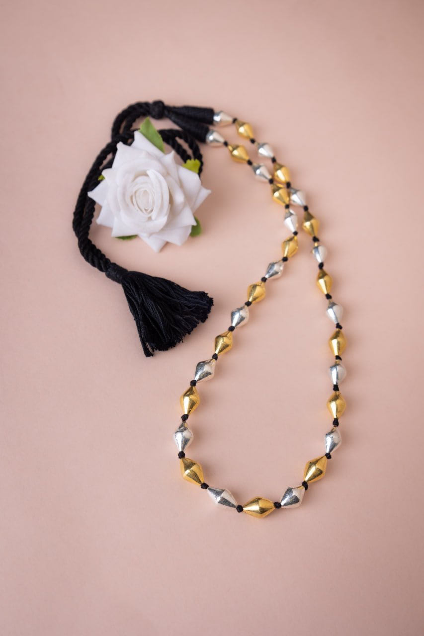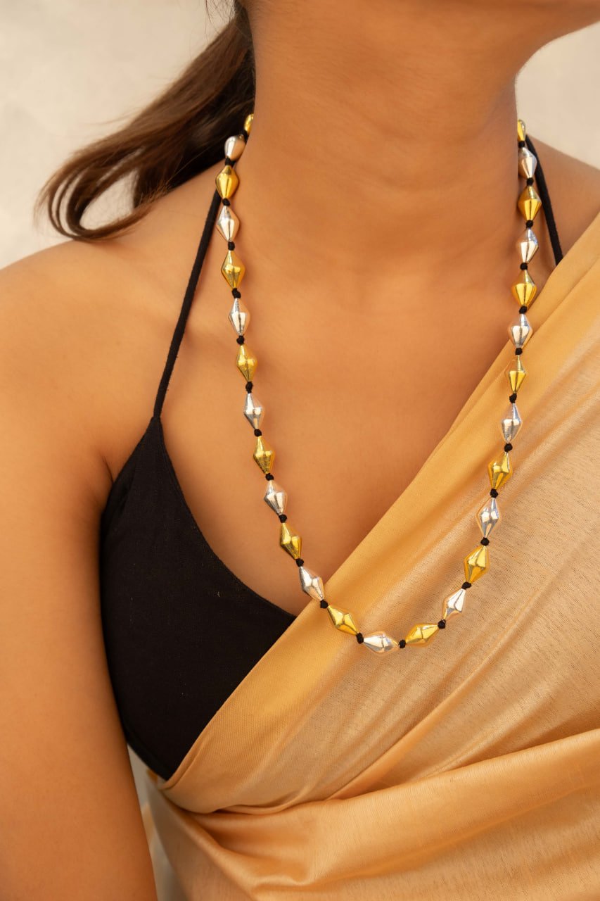 This contemporary mala features alternating gold and silver-toned dholki beads separated by classic black accents, creating a rhythmic pattern that's both modern and rooted in traditional jewelry making. Inspired by the musical beats of dholki drums that bring communities together in celebration, this necklace carries that same harmonious energy with its perfectly balanced dual-tone design that represents the beautiful contrast between different elements coming together in perfect sync.