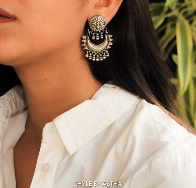 Step into a world of traditional grandeur with our Mizoya Dancing Peacock Motif Ghughri Earring. These captivating silver earrings are meticulously handcrafted from genuine 92.5 sterling silver, promising both exceptional quality and a timeless allure. Each earring features a beautifully detailed top stud, reminiscent of a sun or floral motif, from which suspends a gracefully curved crescent moon adorned with intricate embellishments. Below this elegant arc, delicate "ghughris" (small metallic beads or bells) dangle, creating a subtle, melodious jingle with every movement. The centerpiece of this design is the intricate dancing peacock motif, a symbol of beauty and grace in Indian culture, intricately woven into the design. The oxidized finish lends these traditional silver earrings an authentic, antique charm, highlighting every intricate detail. Perfect for adding a touch of majestic elegance to your ethnic ensemble, these designer silver earrings are ideal for festivities and celebrations.