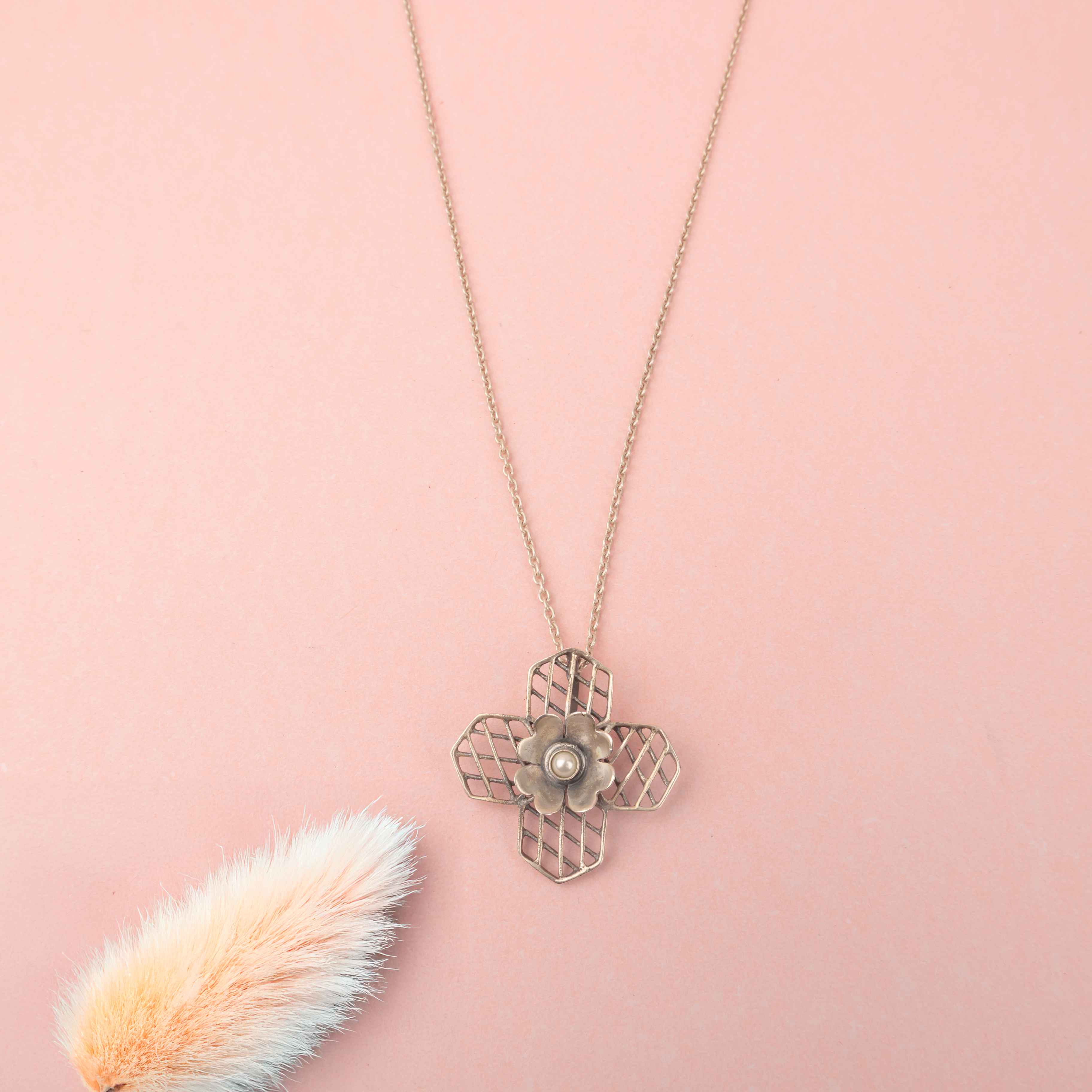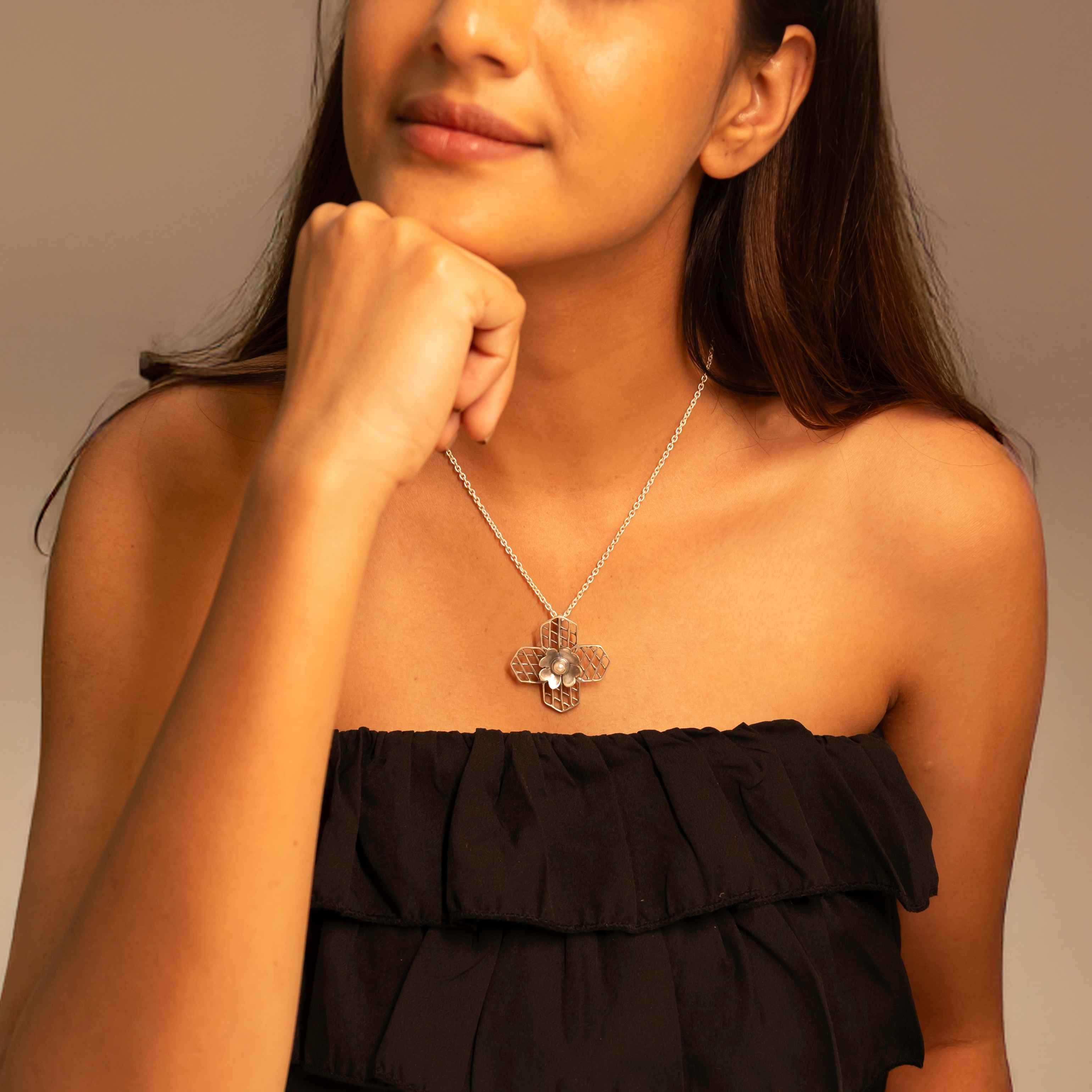 The Mizoya Embossed Flower Jali Necklace showcases intricate floral motifs and a delicate jali (lattice) pattern that shimmer with light, crafting timeless elegance through masterful craftsmanship. Inspired by the blossoms that bloom in serene palace courtyards, each embossed element weaves a tale of delicate beauty meeting lasting strength, creating a piece that feels both ancient and strikingly modern.