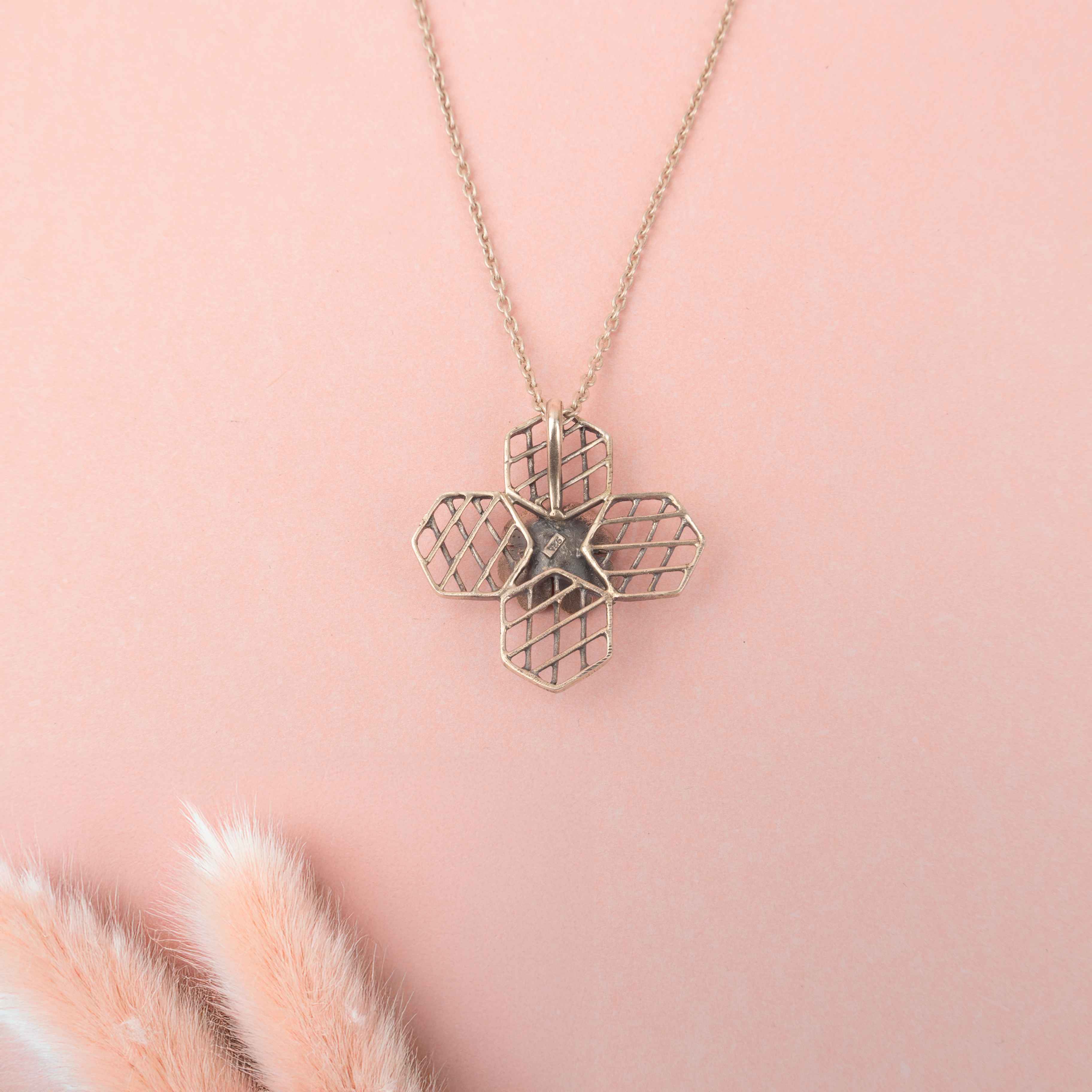 The Mizoya Embossed Flower Jali Necklace Earring Ring Set showcases intricate floral motifs and a delicate jali (lattice) pattern that shimmer with light, crafted through masterful craftsmanship. Inspired by the blossoms that bloom in serene palace courtyards, each embossed element weaves a tale of delicate beauty meeting lasting strength, creating a piece that feels both ancient and strikingly modern. The set includes a necklace, earrings, and ring for a complete ensemble.
