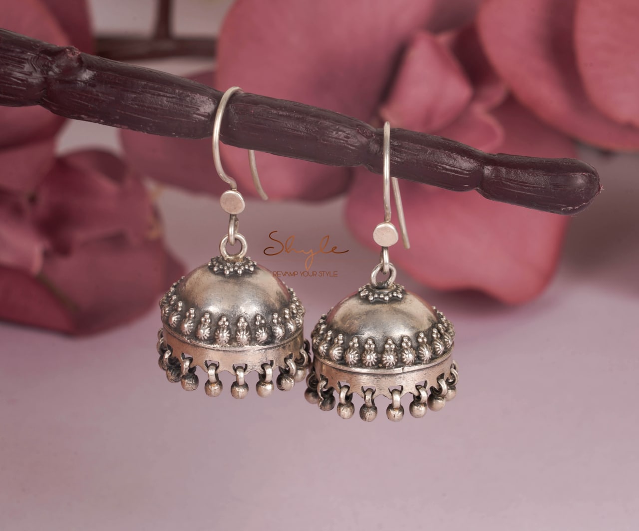 The Mizoya Intricate Daana Detailed Jhumki features an elaborate design with daana (bead) detailing and a polished silver finish, crafted through masterful handcrafted techniques using 92.5 silver. Inspired by the timeless elegance of traditional Indian jewelry, each element blends intricate artistry with enduring strength, creating a piece that feels both classic and ornate.