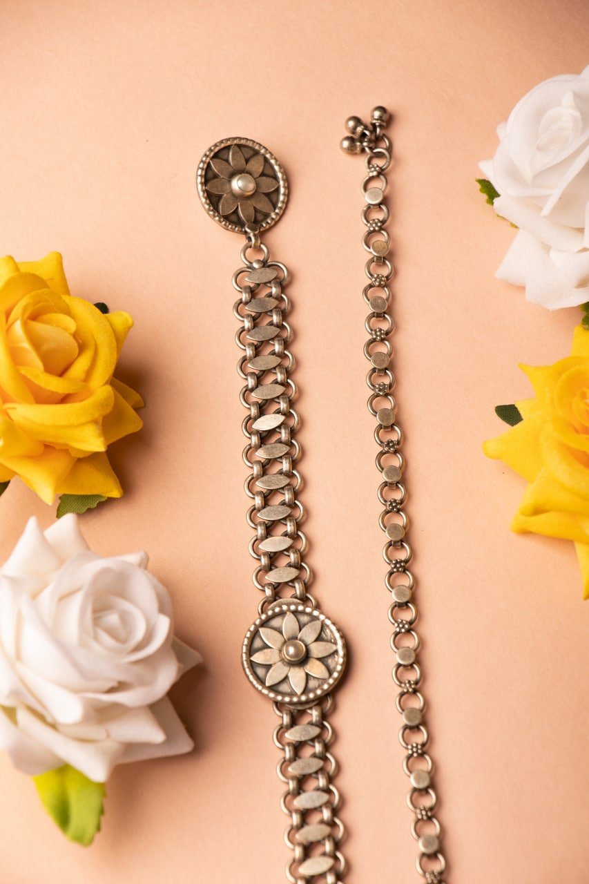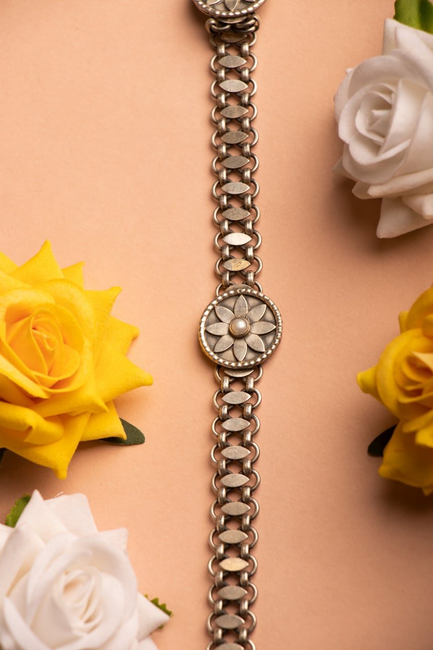 When gardens bloom around your waist, our Mizoya kamarbandh enchants with delicate flower motifs that create poetry in silver. The intricate chain flows with botanical beauty while detailed floral work adds feminine grace to this timeless piece. Perfect for celebrations where you want nature's elegance to embrace your silhouette with classical charm.