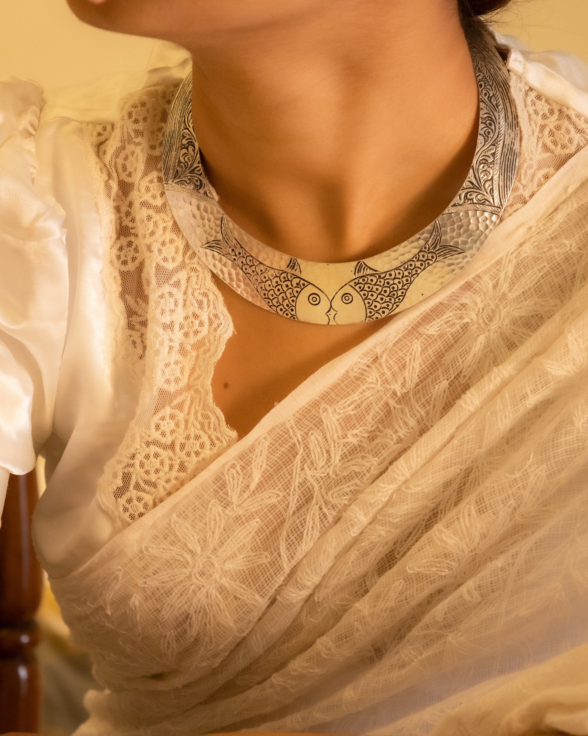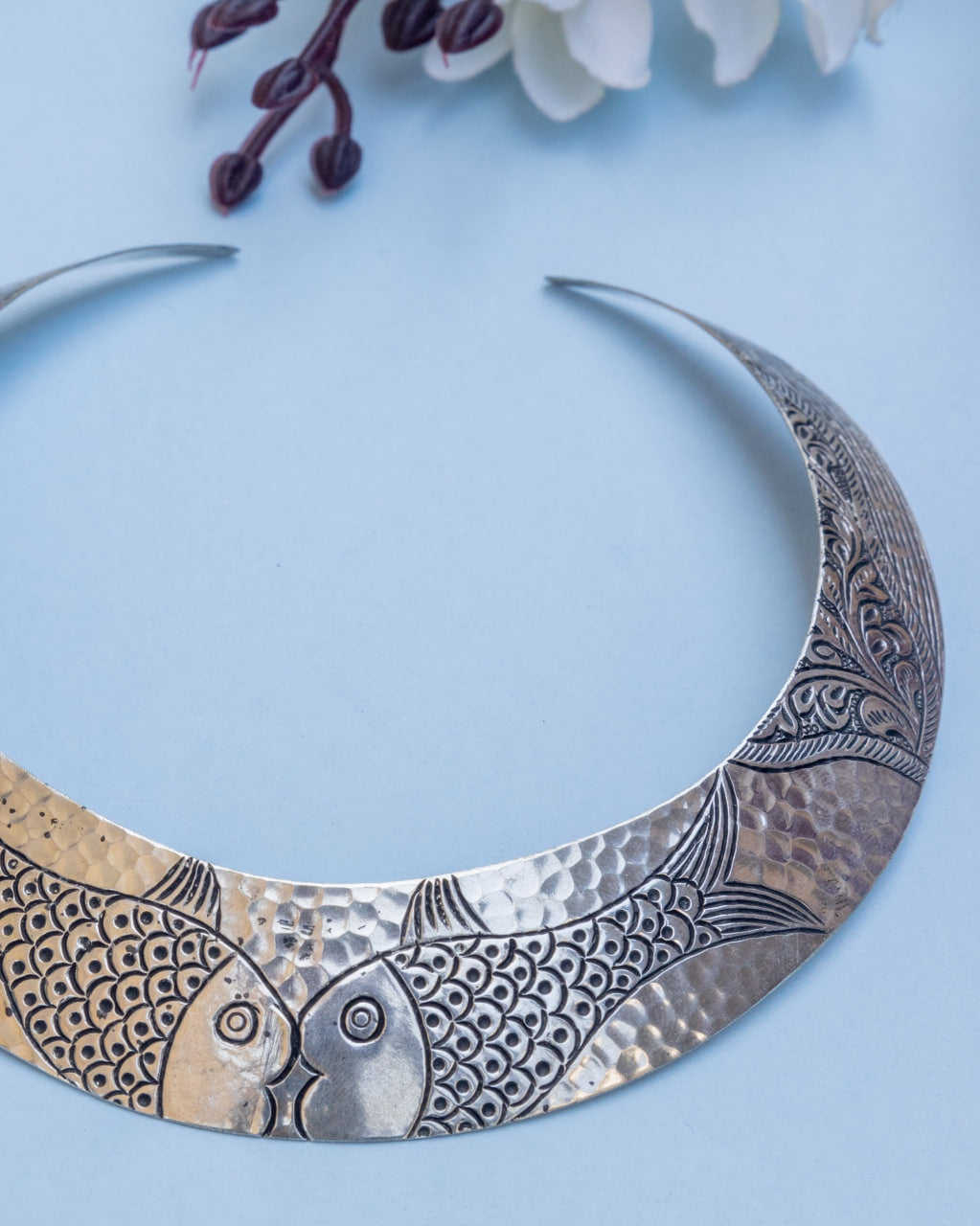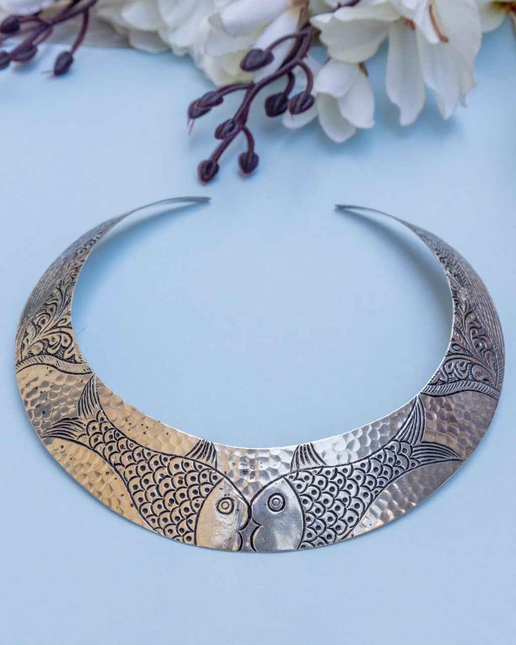 This stunning carved textured hasli brings traditional craftsmanship into modern wardrobes with its intricate detailing and contemporary silhouette. The beautiful texture work creates depth and dimension, making it a statement piece that celebrates heritage while staying effortlessly chic. Inspired by the timeless beauty of Indian artisanal jewelry, this hasli captures the essence of generations of skilled craftspeople who poured their hearts into creating pieces that tell stories.