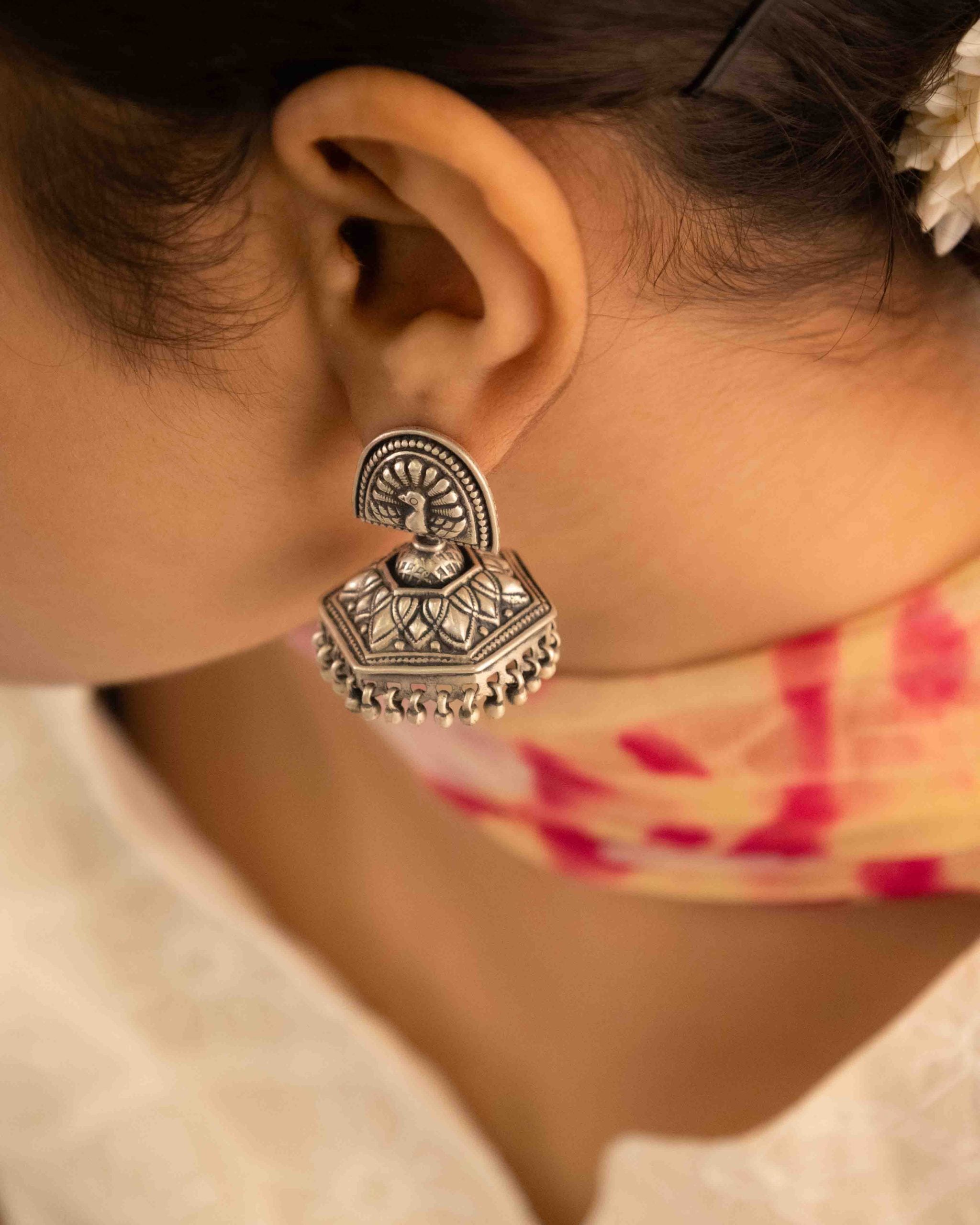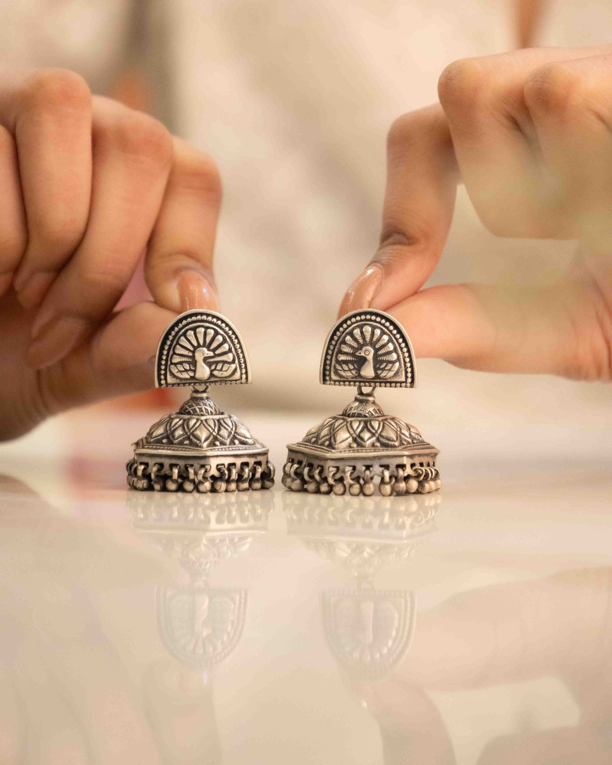 The Mizoya Peacock Motif Embossed Intricate Jhumka features a detailed peacock motif with embossed textures and a polished silver finish, crafted through masterful handcrafted techniques using 92.5 silver. Inspired by the timeless elegance of traditional Indian jewelry, each jhumka blends intricate artistry with enduring strength, creating a culturally rich and elegant piece.