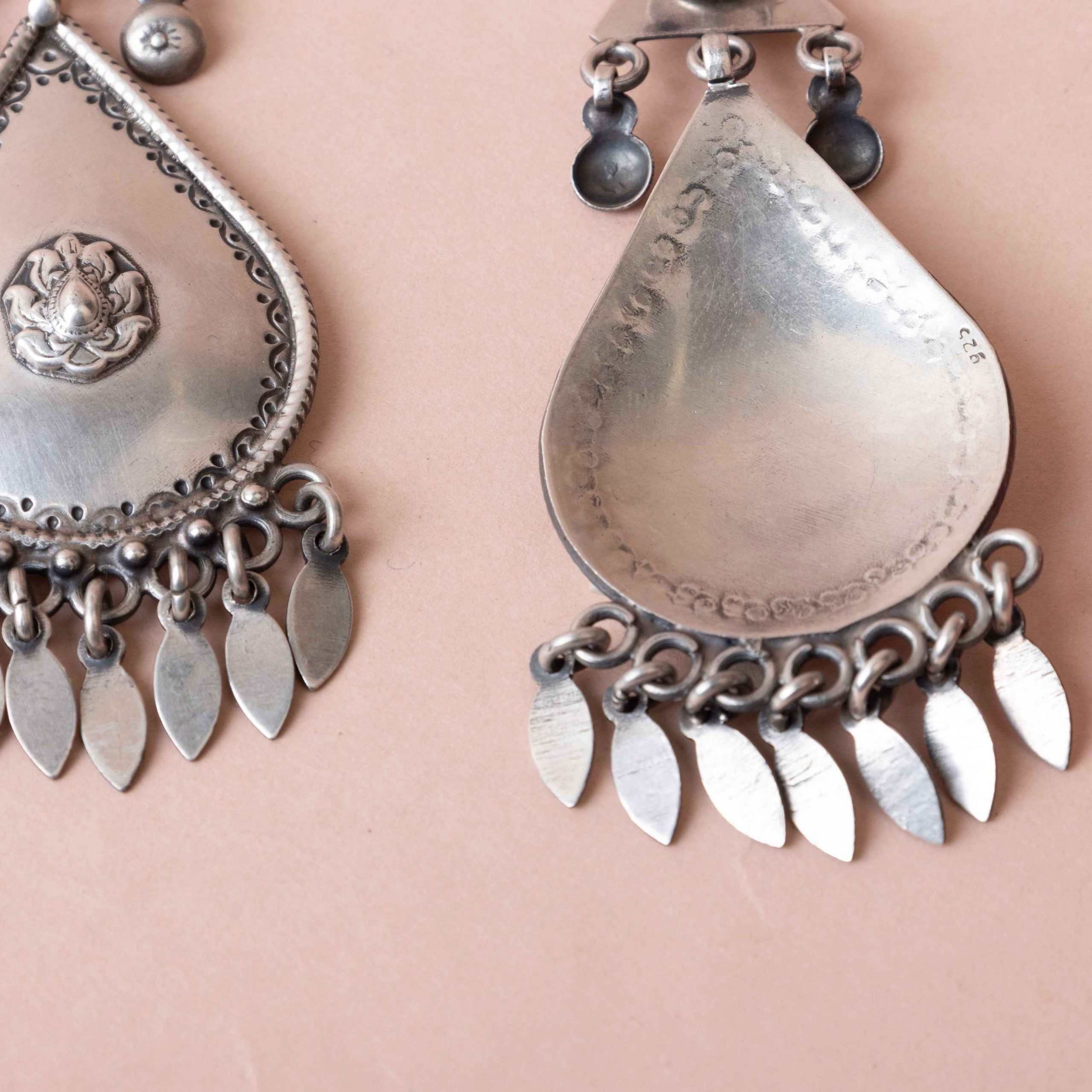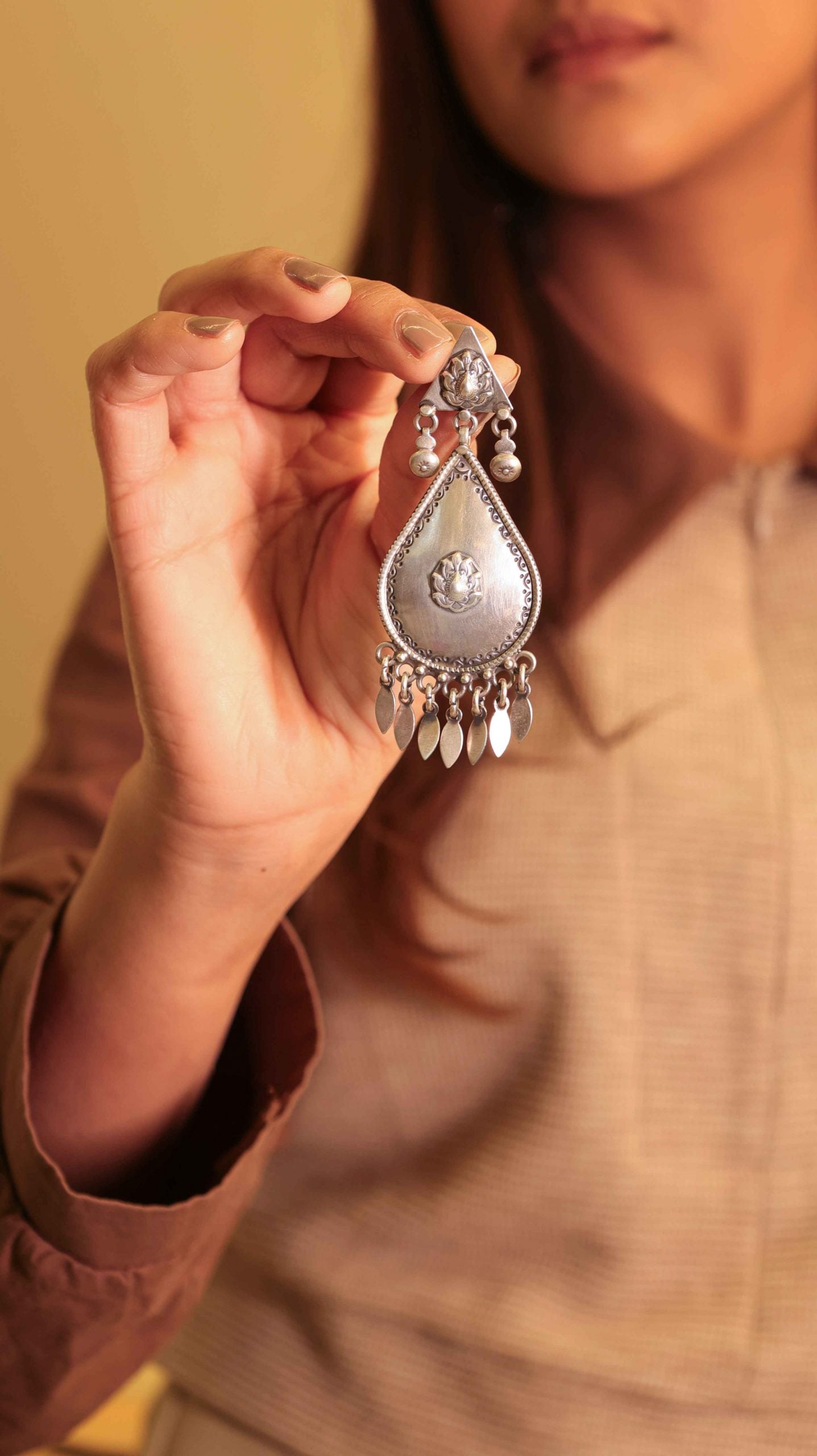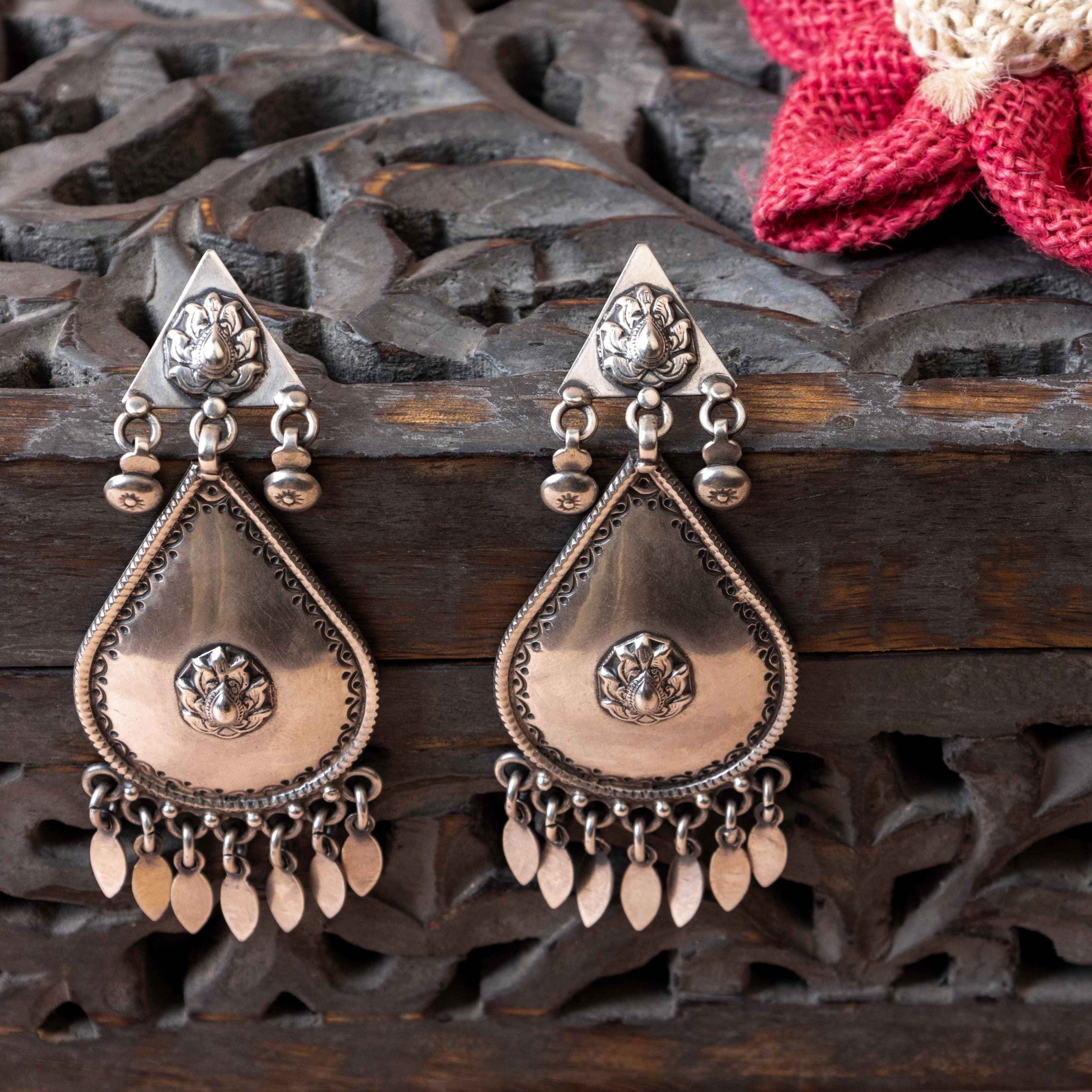 Channel ancient elegance with the Mizoya Tribal Inspired Drop Dangling Earrings, where traditional teardrop motifs meet exquisite tribal craftsmanship. These captivating earrings feature an ornate geometric stud that gracefully transitions into a beautifully sculpted teardrop pendant, adorned with intricate engravings and a stunning central focal point. The cascading fringe of delicate silver drops creates enchanting movement and musical chimes, while the oxidized silver finish adds authentic depth and character. Perfect for the culturally conscious woman who appreciates indigenous artistry and wants to honor traditional design heritage.