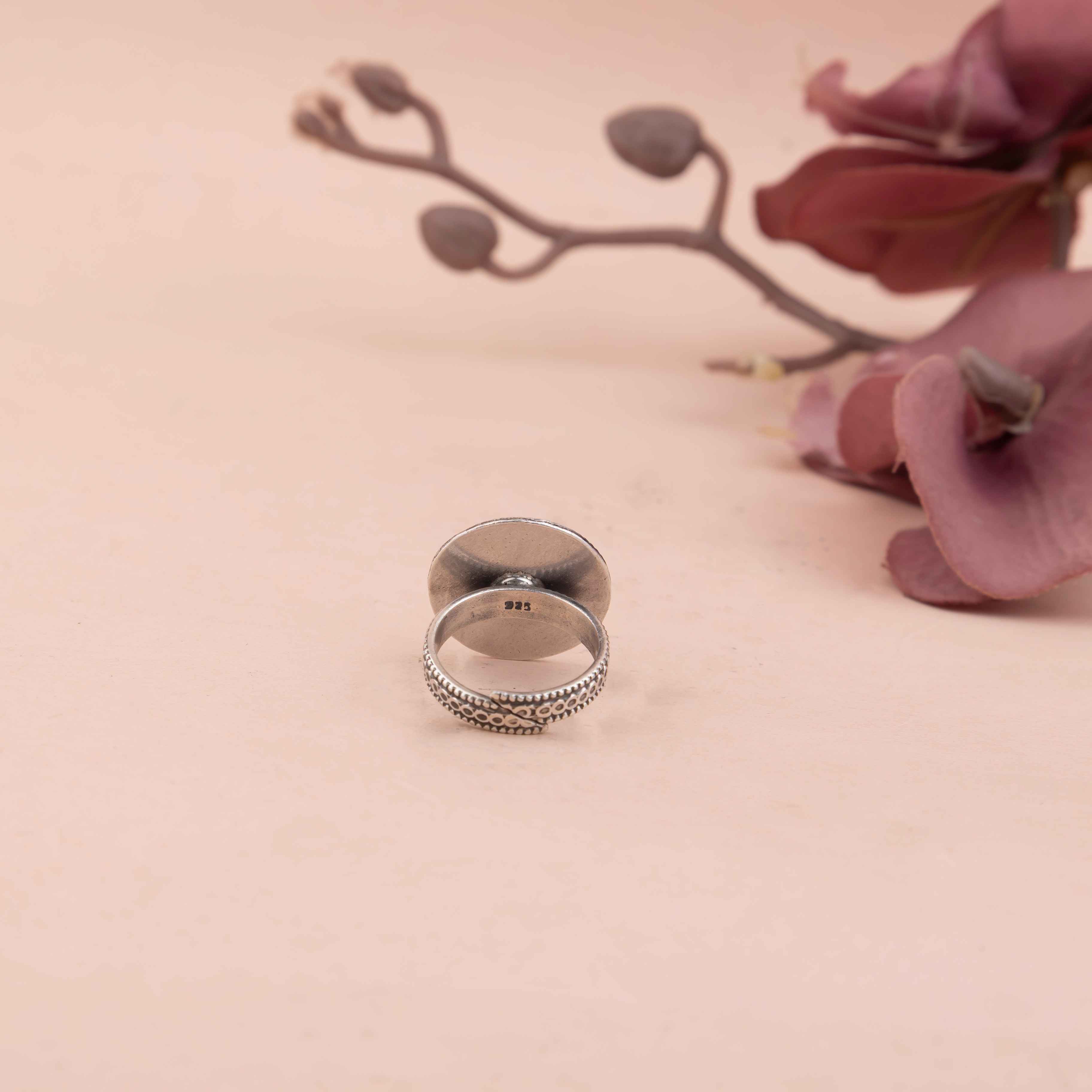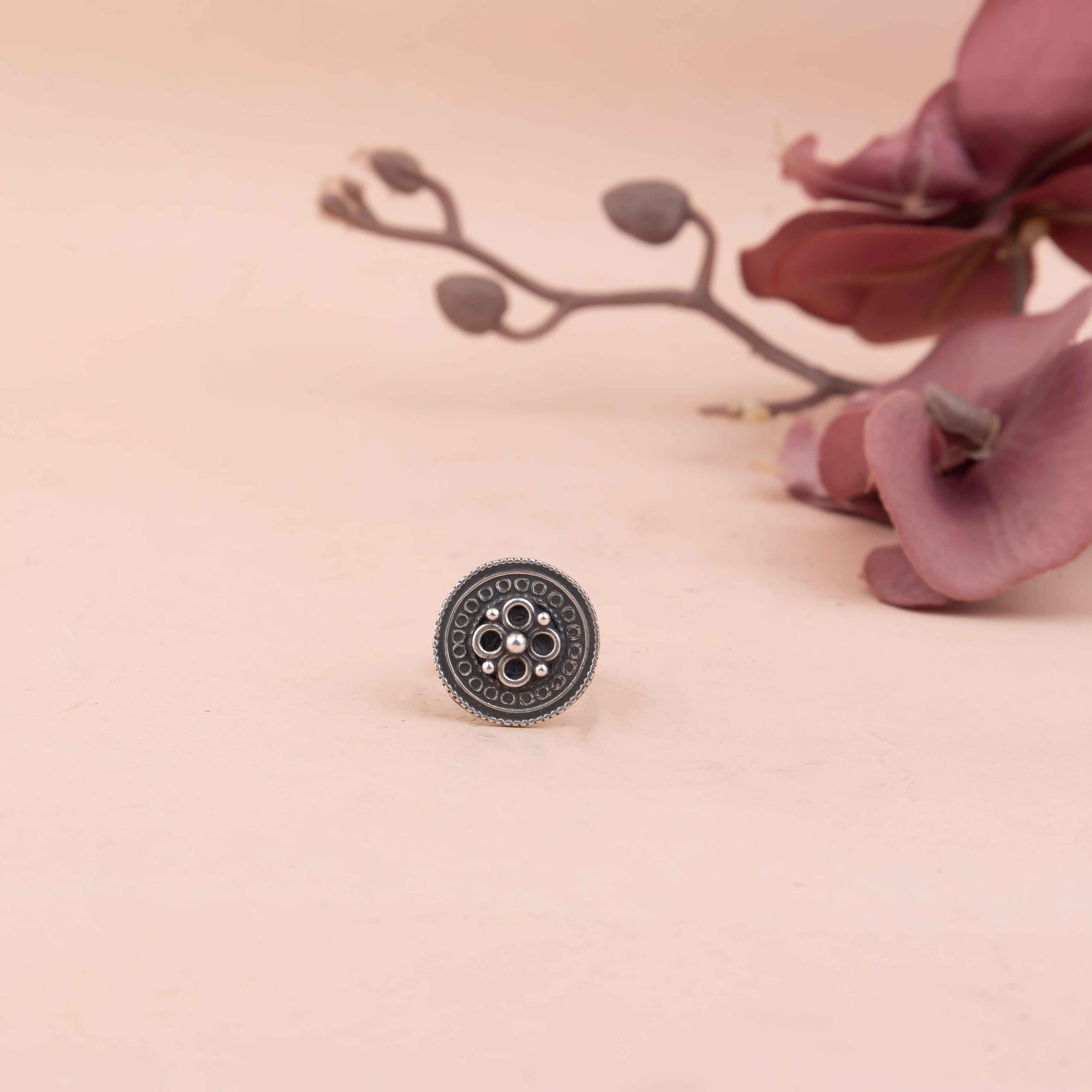 Crafted in 92.5 sterling silver with a 92.5 purity stamp, the Mizoya Tribal Inspired Everyday Ring features a striking circular design with intricate tribal patterns and a central pearl accent. Its detailed craftsmanship and versatile finish make it a standout piece for women’s fashion jewelry. Perfect for wedding jewelry, elegant accessories, and handcrafted silver rings, this premium silver ring adds a touch of cultural charm to any outfit, ideal for festive celebrations and daily styling.
