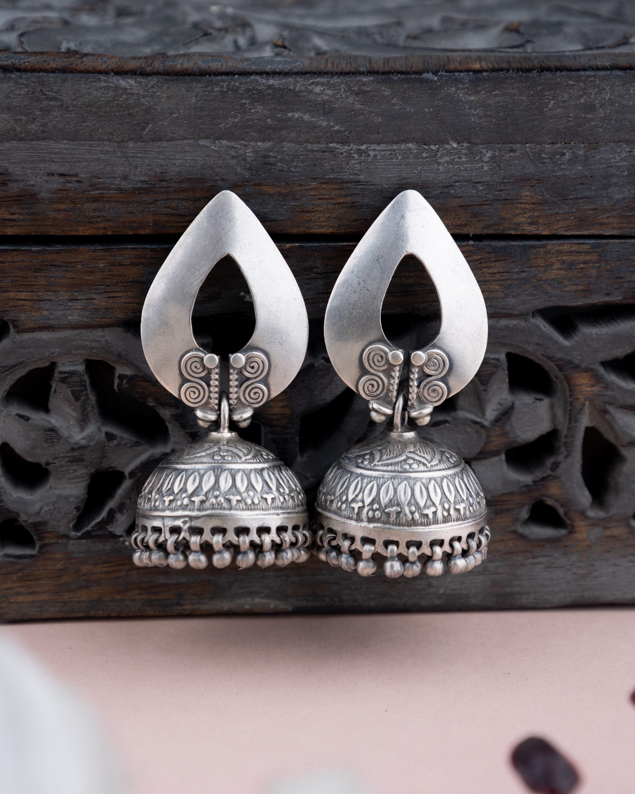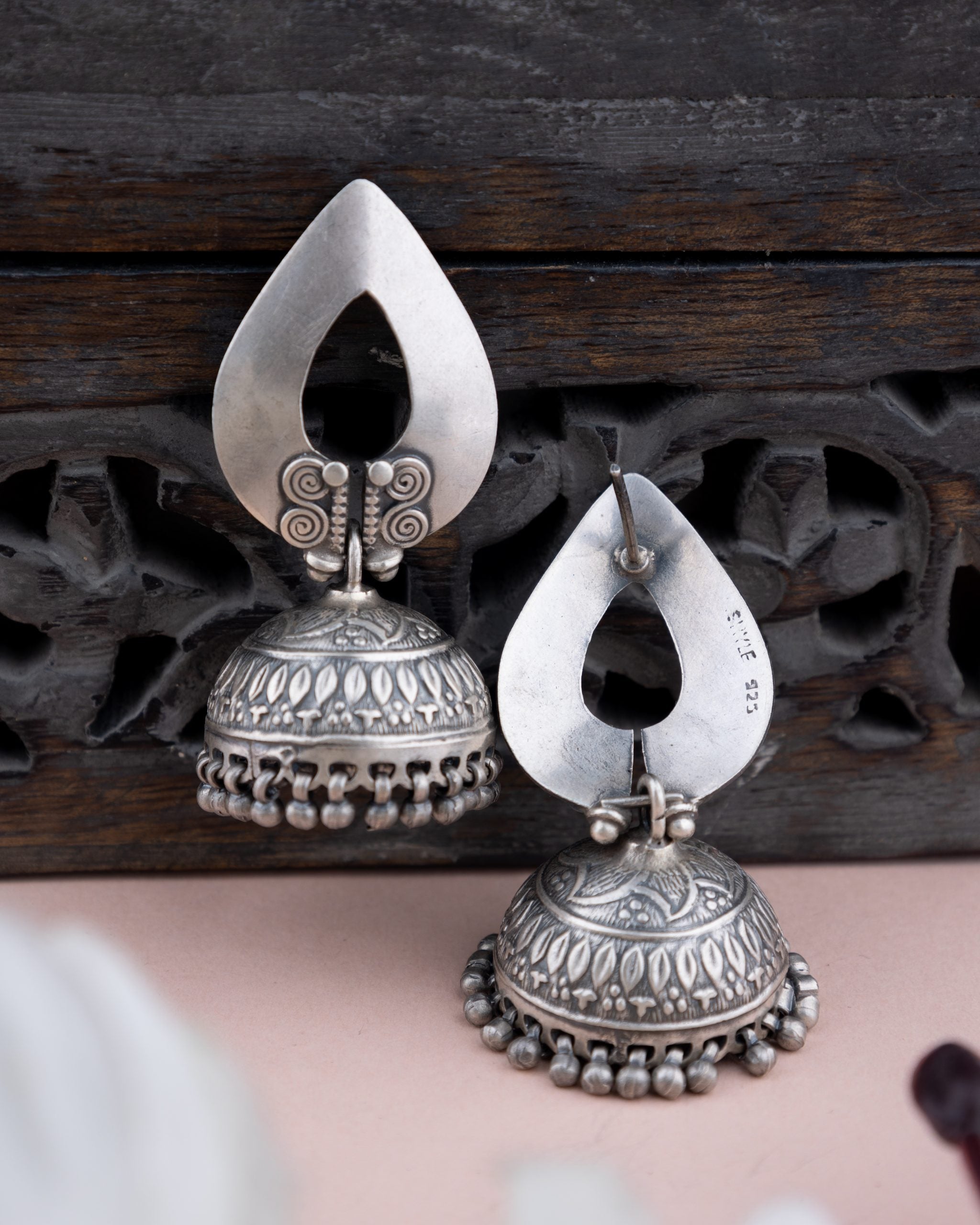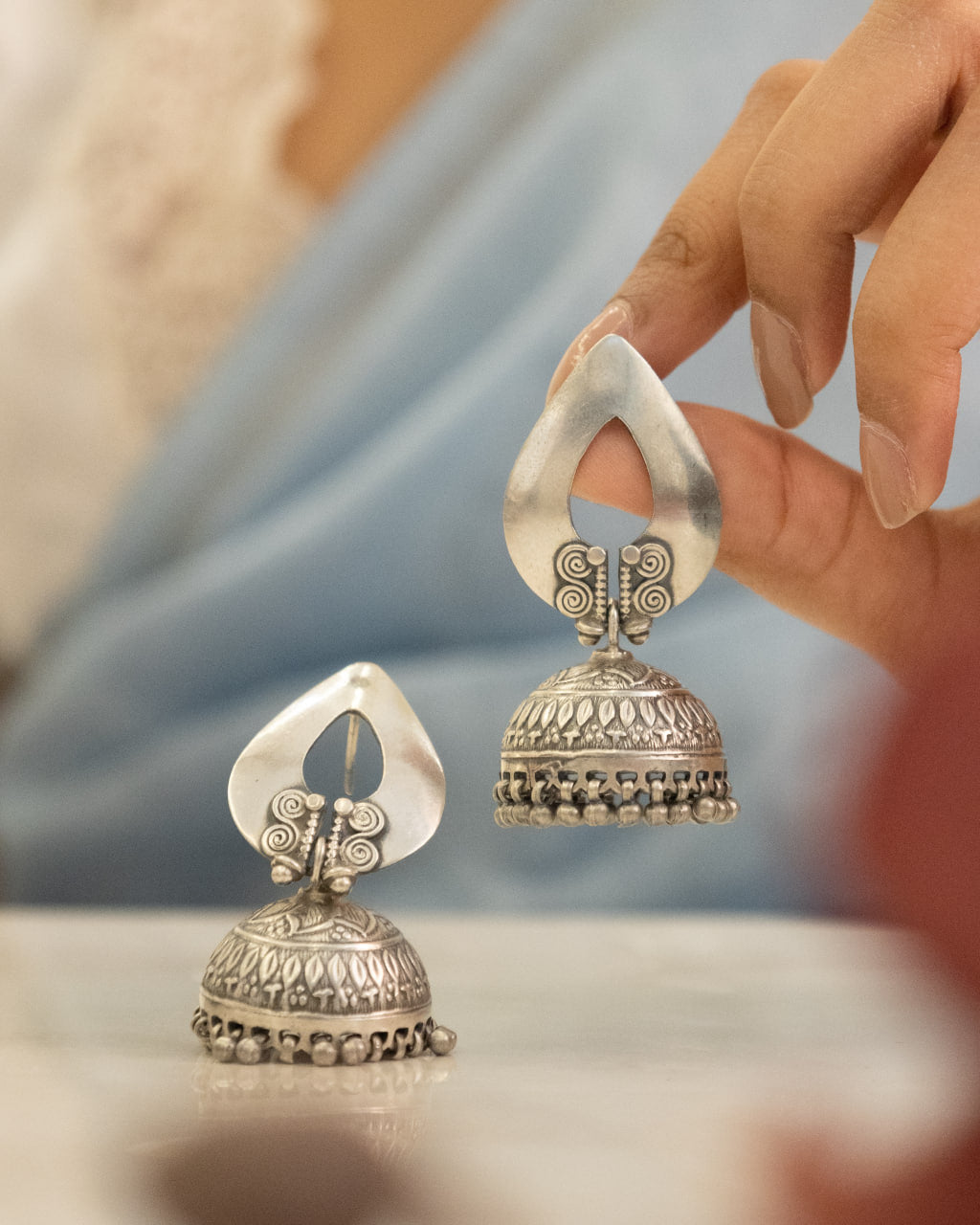The Mizoya Trinetra Motif Intricate Jhumka features an elaborate design with a tri netra (three-eyed) motif and a polished silver finish, crafted through masterful handcrafted techniques using 92.5 silver. Inspired by the timeless elegance of traditional Indian jewelry and the symbolism of Lord Shiva, each element blends intricate artistry with enduring strength, creating a piece that feels both classic and spiritual.