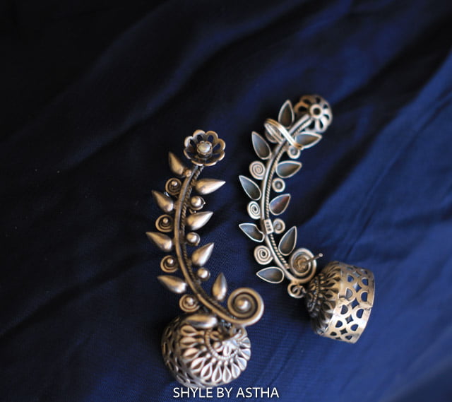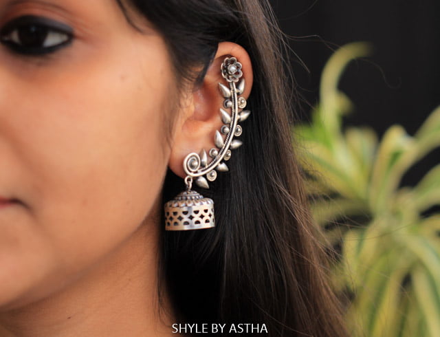 Embrace a harmonious blend of natural elegance and classic charm with our Moh Freshwater Pearl Bell Leaf Earcuff. This exquisite silver ear cuff and drop earring is meticulously handcrafted from genuine 92.5 sterling silver, ensuring both artistic beauty and exceptional quality. Designed to gracefully adorn the contours of your ear, it features an intricately detailed vine of delicate leaves, culminating at the top with a subtle flower detail. From this verdant stem hangs a beautifully crafted bell-shaped jhumka, adorned with intricate cutwork that allows light to play beautifully through its design. A lustrous freshwater pearl gracefully dangles from the base of the jhumka, adding a touch of timeless sophistication.