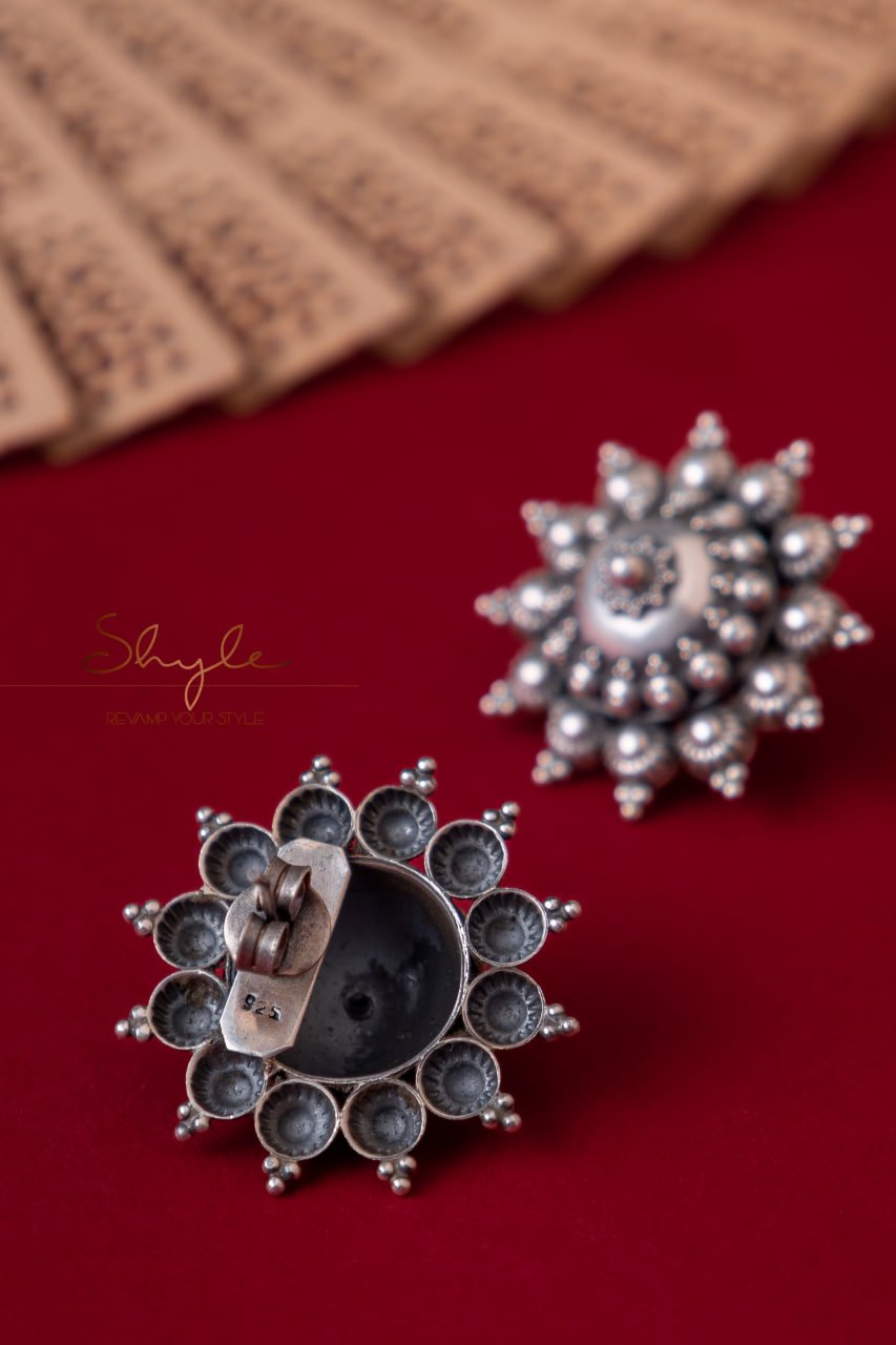 The Moh Daana Detailed Embossed Classic Stud Earring features an intricate daana (beaded) design with embossed details and a polished silver finish, crafted through masterful handcrafted techniques using 92.5 silver. Inspired by the timeless elegance of traditional Indian jewelry, each element blends detailed artistry with enduring strength, creating a piece that feels both classic and refined.