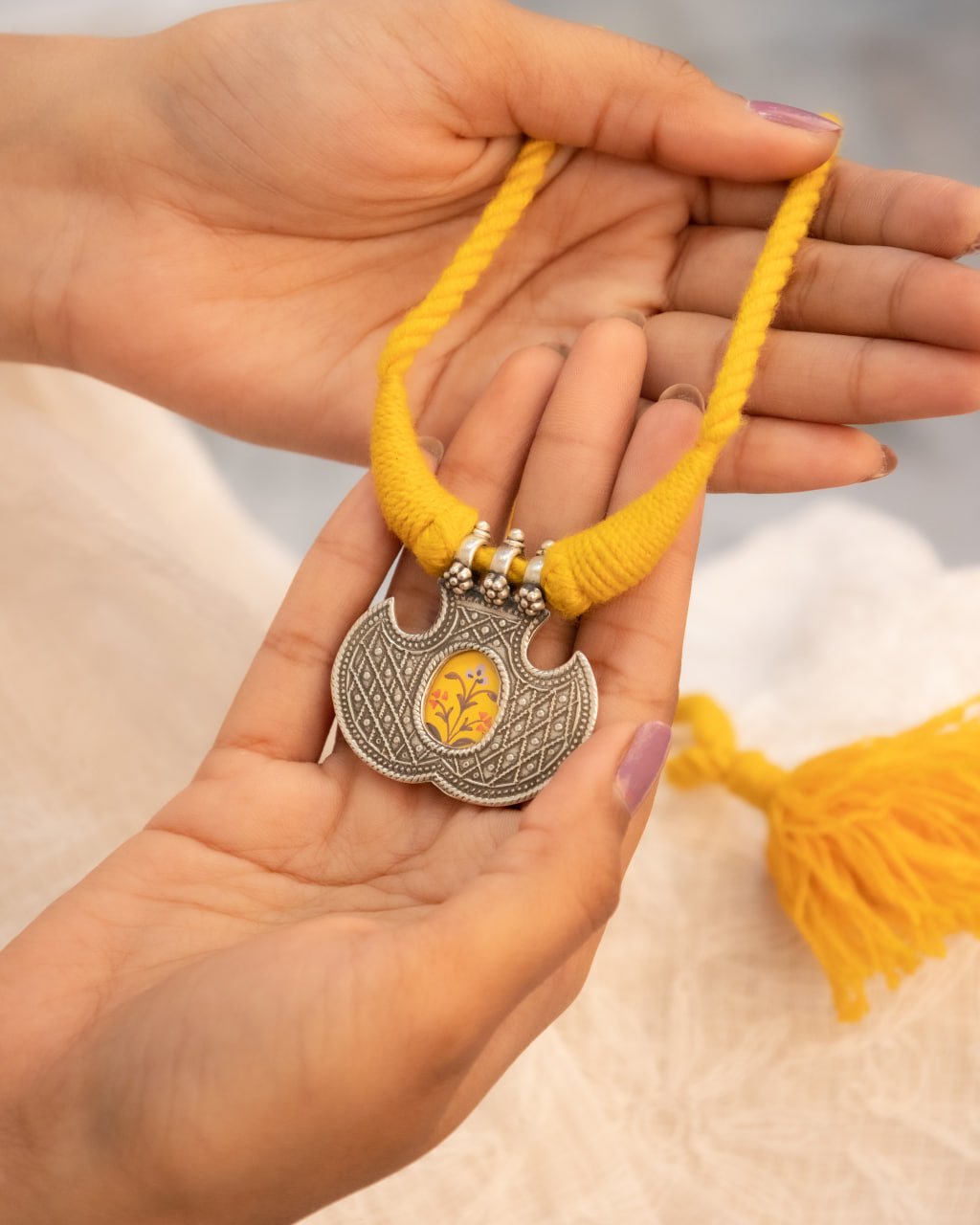 The Moh Flora Hand Painted Intricate Dori Necklace is a vibe of its own, featuring a silver pendant with delicate hand painted floral art in vibrant yellow, framed by intricately carved patterns, and strung on a bold mustard dori that adds a playful yet artsy touch. Inspired by the burst of colors in a wildflower meadow during a carefree summer picnic, this unique piece brings a fresh and artistic charm to your collection.
