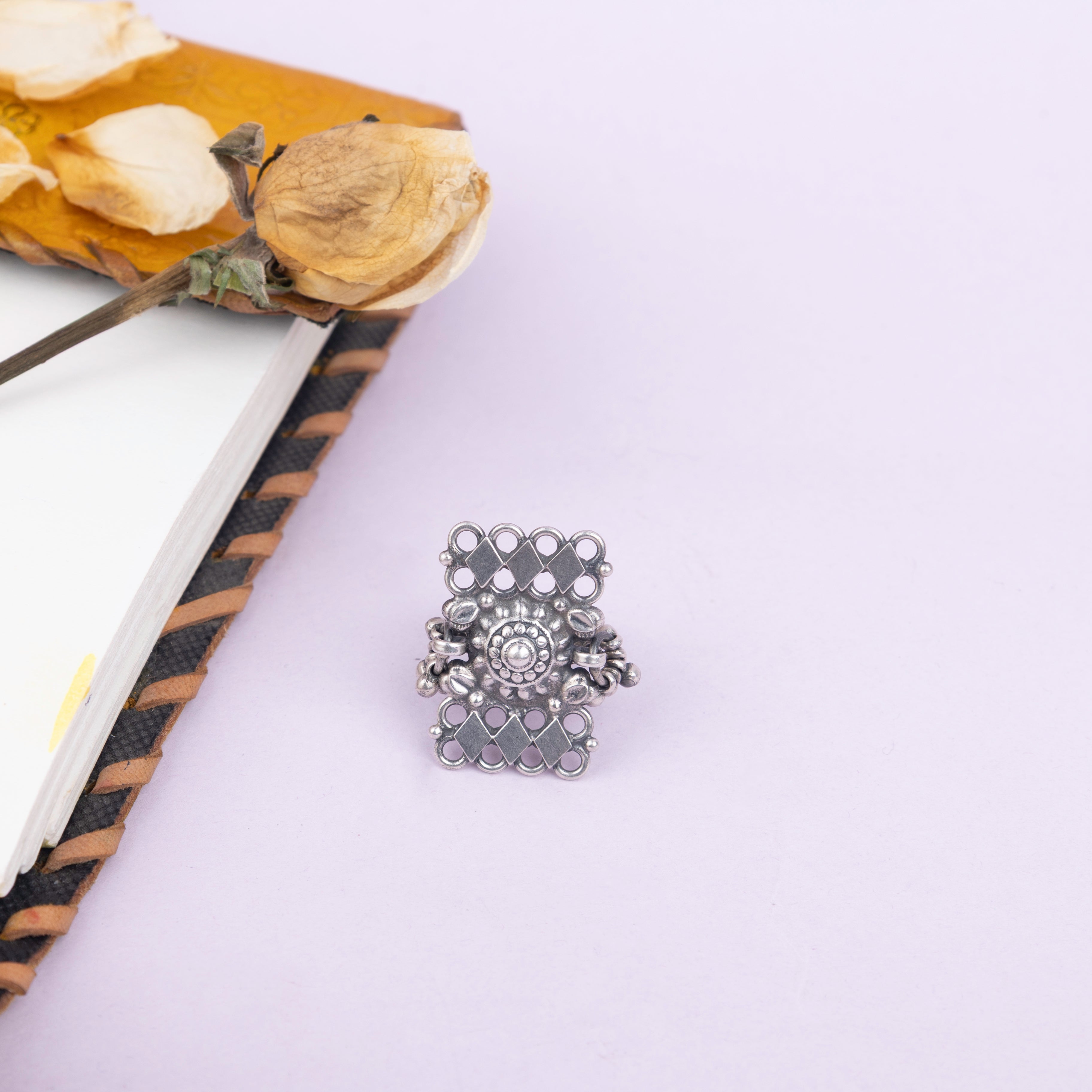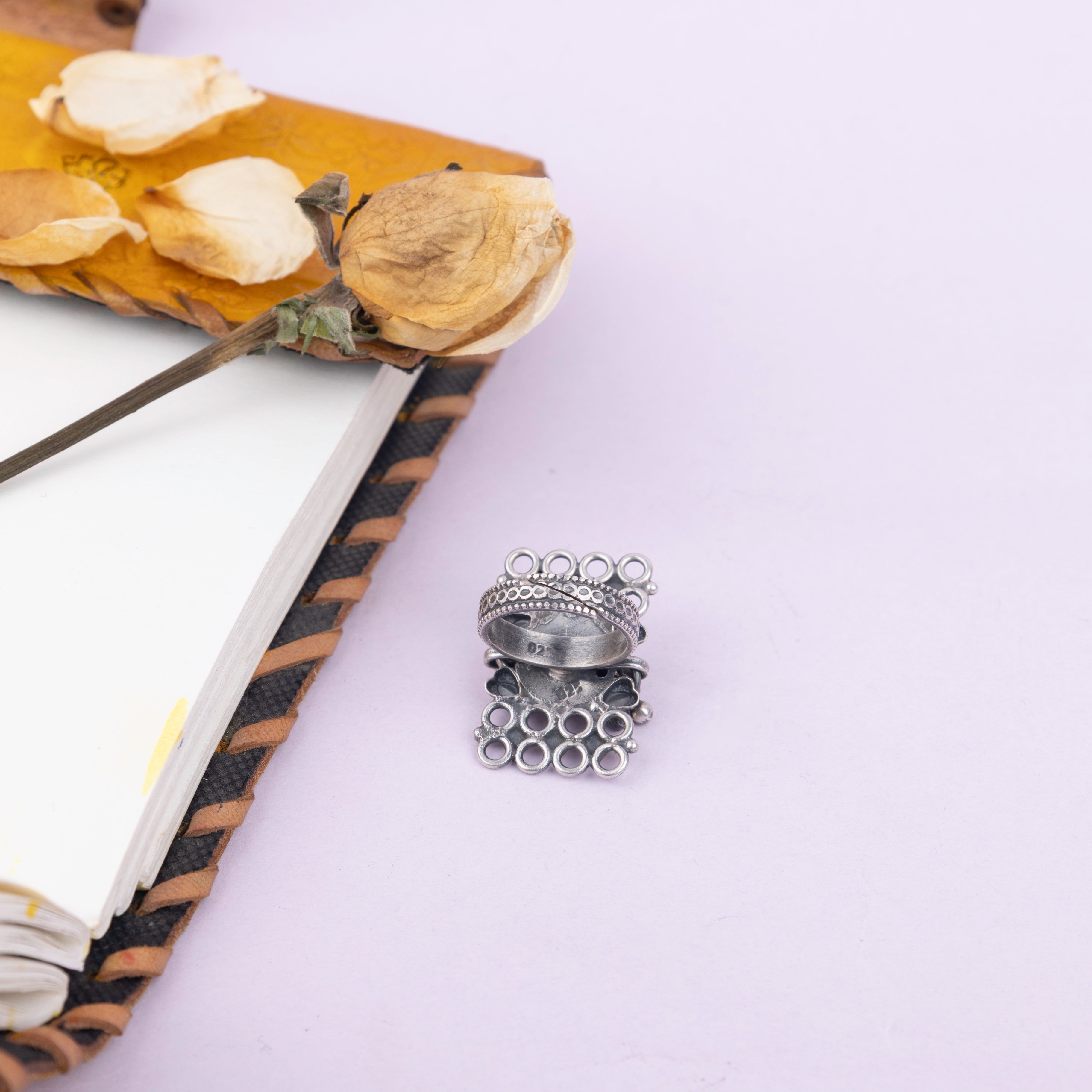 Crafted in 92.5 sterling silver with a 92.5 purity stamp, the Moh Intricate Jali Ghughri Drop Ring features a striking square design with intricate jali work and dangling ghungroo bells. Its detailed craftsmanship and dynamic finish make it a standout piece for women’s fashion jewelry. Perfect for wedding jewelry, elegant accessories, and handcrafted silver rings, this premium silver ring adds a touch of cultural heritage to any outfit, ideal for festive celebrations and cultural occasions.