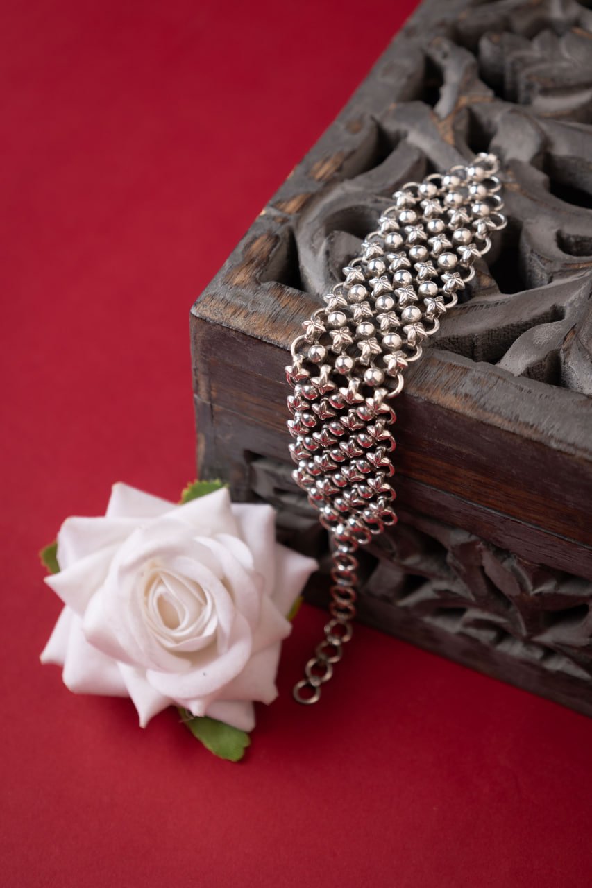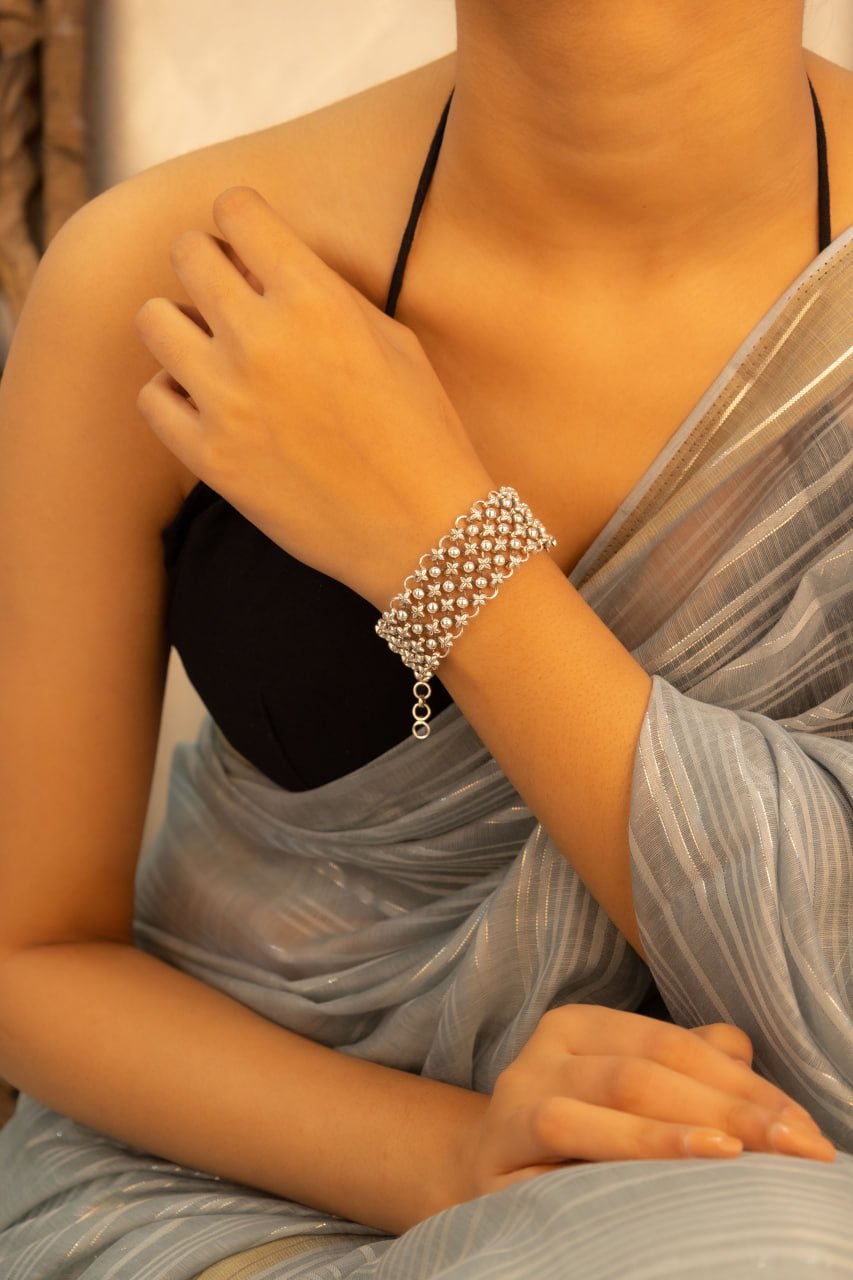 The Moh Intricate Jali Statement Bracelet features an elaborate jali (perforated) design with a polished silver finish that gleams softly, crafted through masterful handcrafted techniques using 92.5 silver. Inspired by the intricate elegance of traditional Indian craftsmanship, each detailed element blends delicate artistry with bold sophistication, creating a piece that feels both timeless and strikingly modern. Perfect for standout appearances.