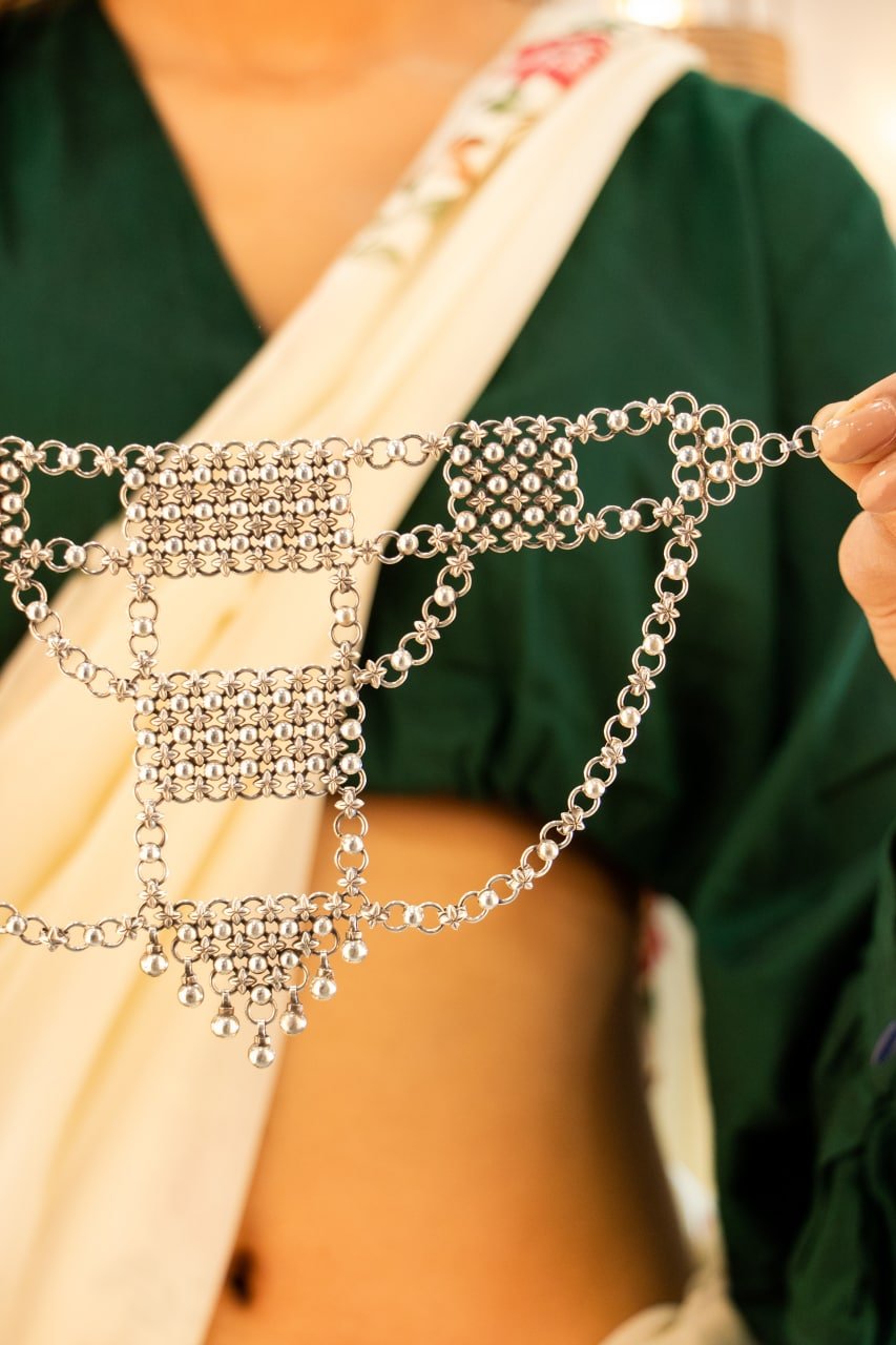 This stunning layered statement necklace features intricate jali work in cascading geometric patterns, creating a dramatic multi tiered design that combines traditional perforated metalwork with contemporary layering trends. Inspired by the magnificent jali screens of ancient Indian architecture where light danced through carved patterns to create magical shadows, this piece transforms that same architectural poetry into wearable art, celebrating the timeless craft where every perforation tells a story of skilled artisanship and breathable beauty.