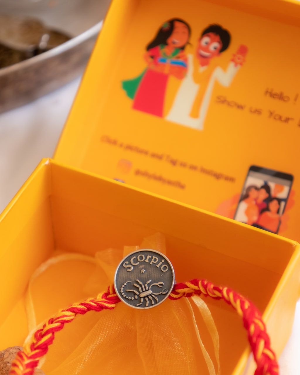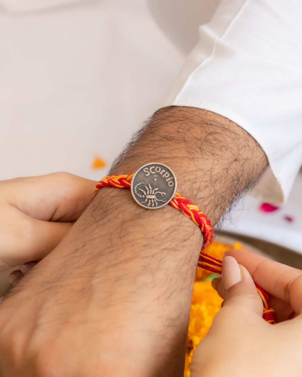 Our Moh Scorpio Sun Sign Brooch Cum Rakhi captures the scorpion's intense energy and transforms it into a beautiful celebration that honours the deep bond found in sibling relationships.