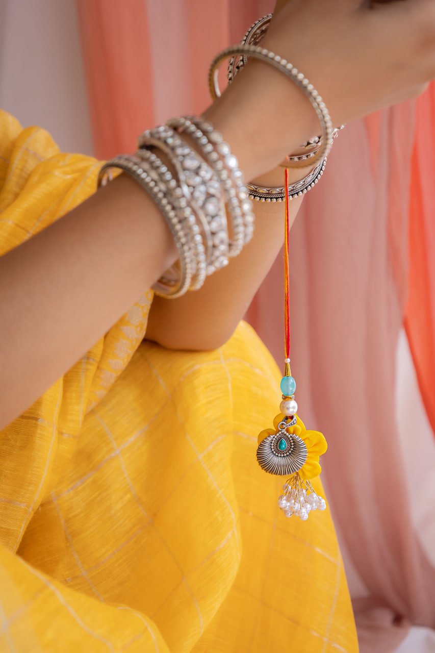 Our Moh Sea Shell Pendant Blooming Lumba Rakhi captures oceanic elegance and transforms it into a beautiful celebration that honours the flowing grace found in the special nanad-bhabhi relationship, like the eternal rhythm of chuda ceremonies.