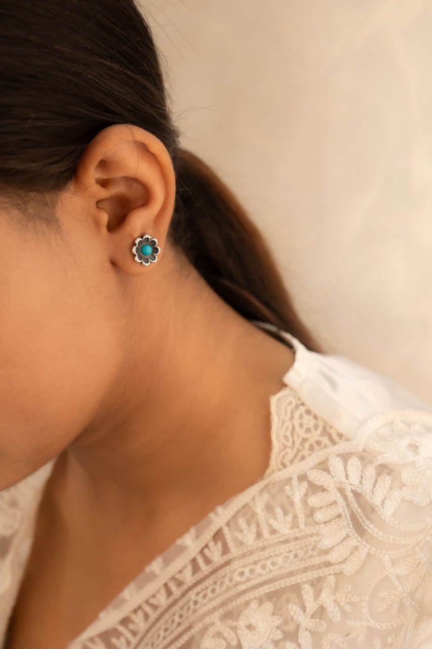 The Moh Turquoise Flower Stud Earring features a vibrant turquoise floral design with a polished silver finish, crafted through masterful handcrafted techniques using 92.5 silver. Inspired by the timeless elegance of traditional Indian jewelry, each element blends striking stonework with enduring strength, creating a piece that feels both classic and luxurious.