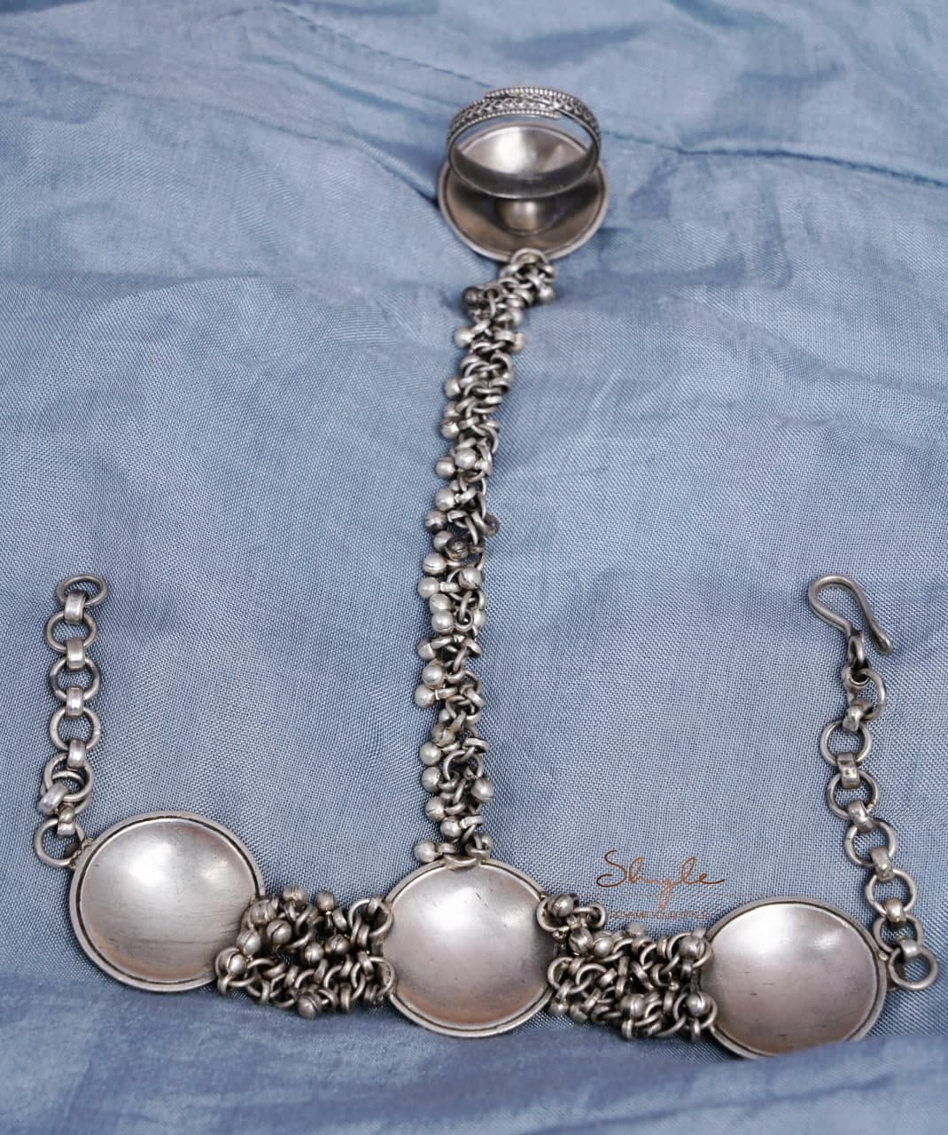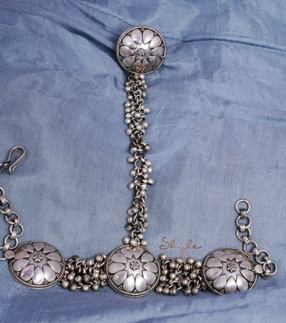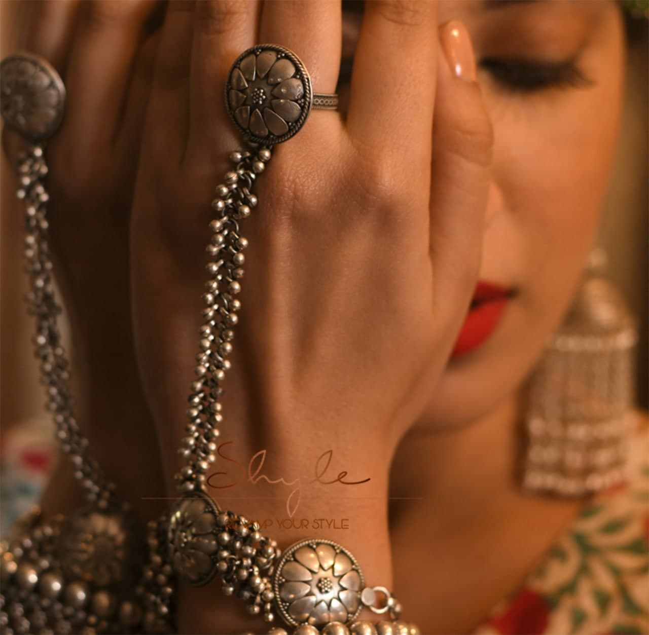 The Moh Intricate Petal Motif Ghughri Statement Hathphool is a stunning embodiment of tradition and elegance, handcrafted in 92.5 sterling silver with a delicate gold plating. Inspired by Indian heritage, its intricate petal motif and ghughri detailing create a mesmerizing hand jewelry piece. Lightweight yet luxurious, this hathphool blends cultural charm with sophisticated style.