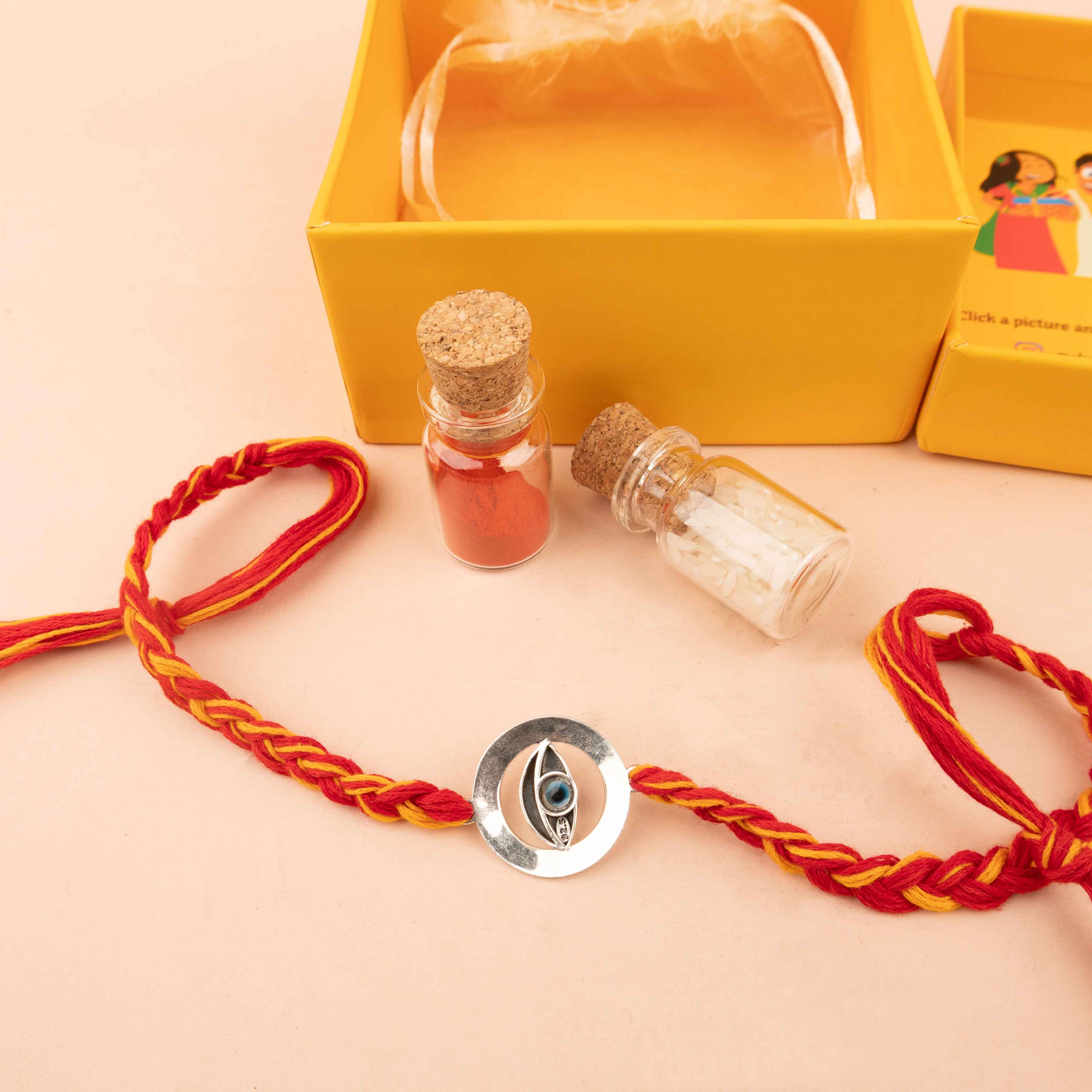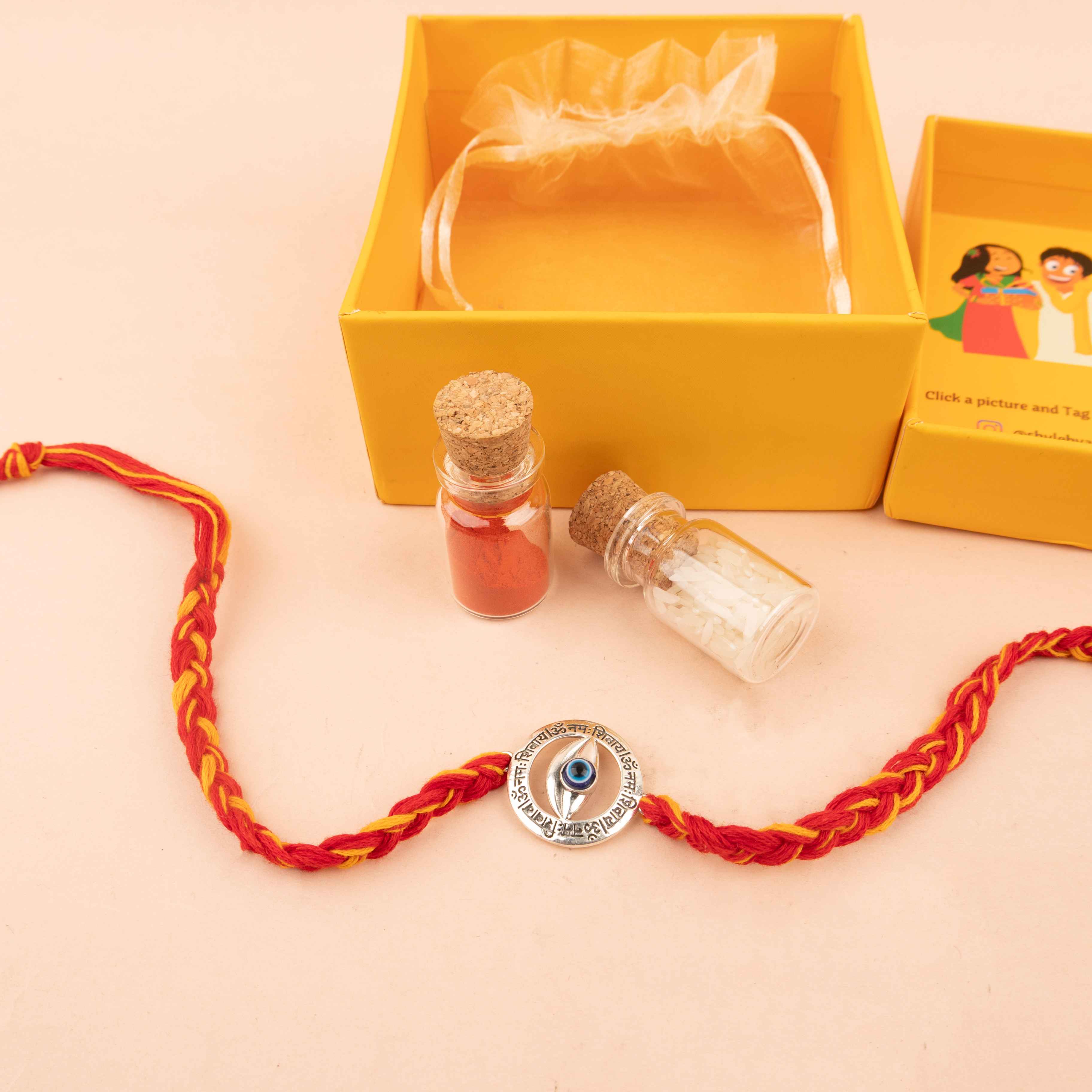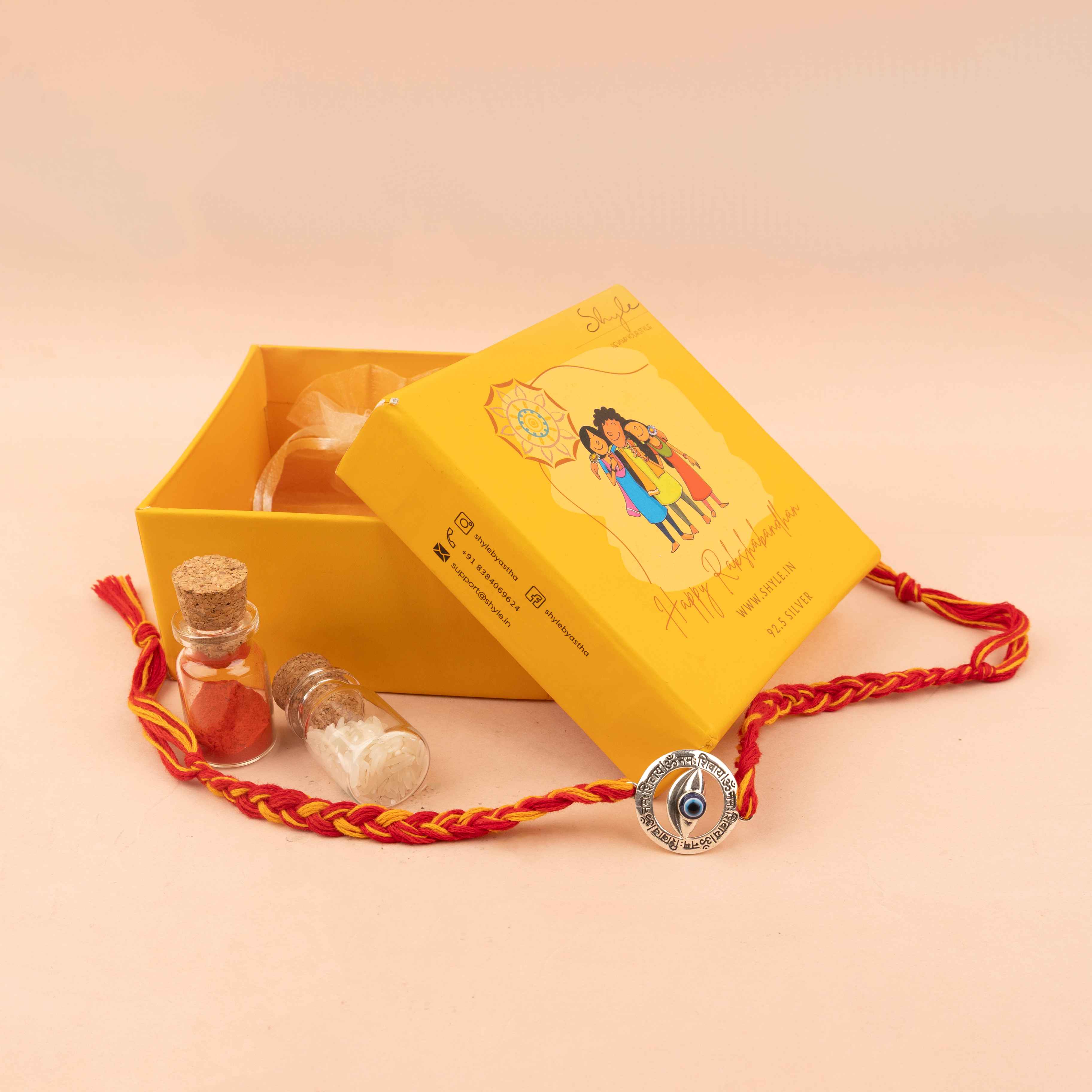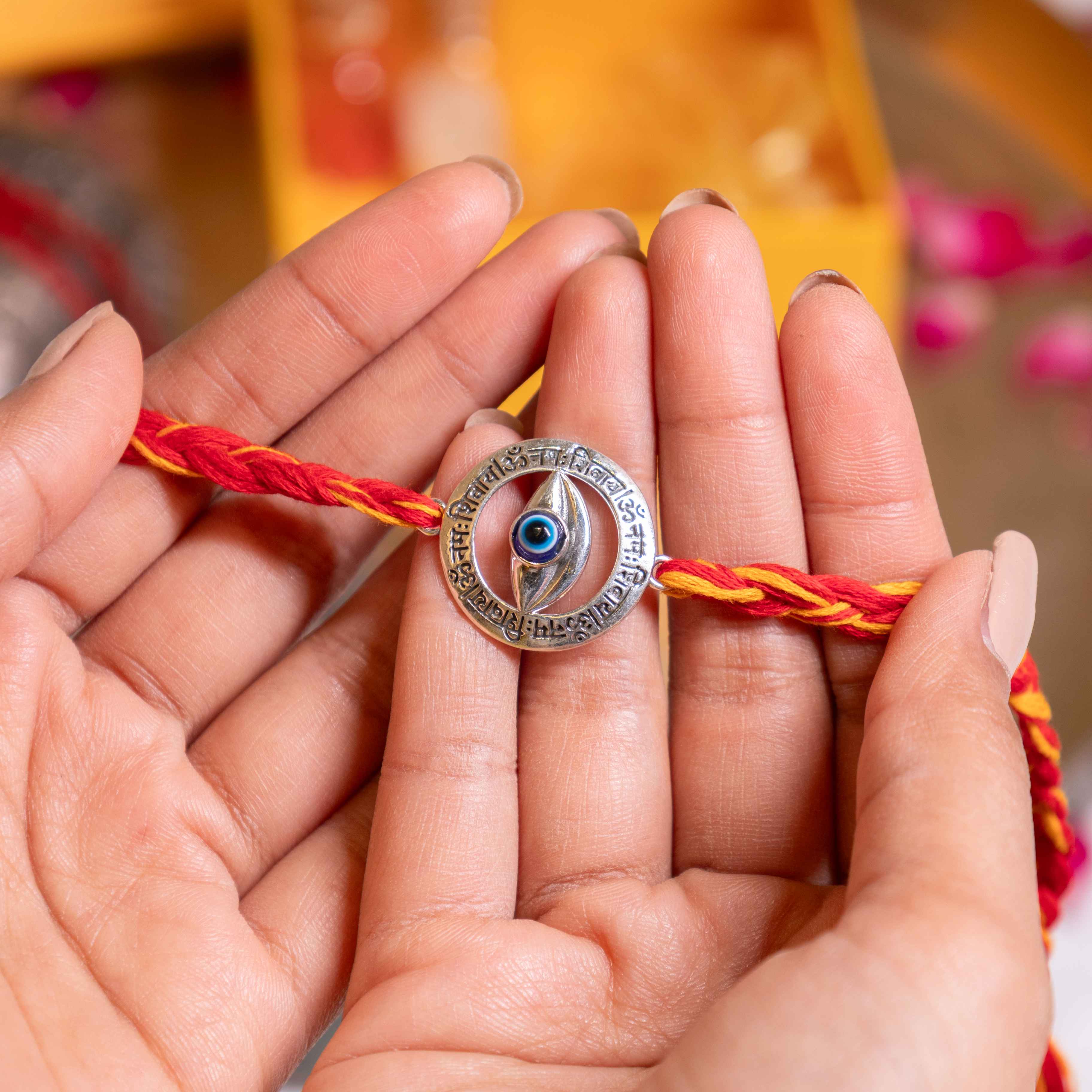Celebrate protection and devotion with the Shiva Trinetra Evil Eye Rakhi, featuring a sacred design inspired by Lord Shiva’s third eye, symbolizing wisdom and warding off evil. This elegant piece, crafted in pure silver, blends spiritual significance with a striking evil eye motif, making it a perfect gift for your brother.