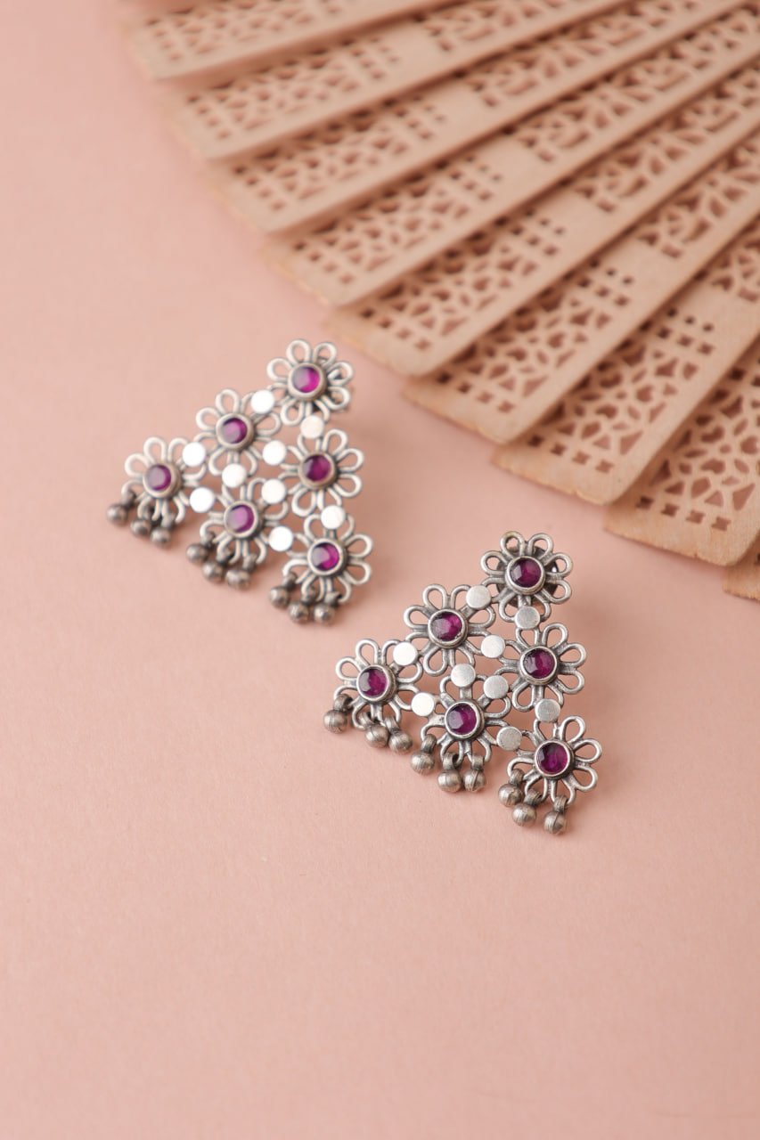 Embrace the poetry of nature with the Tattva Carved Flower Cluster Statement Earrings, where delicate blooms come alive in precious silver. These magnificent pieces showcase an enchanting cascade of intricately carved flowers, each petal lovingly detailed to create a breathtaking garden of elegance. Adorned with vibrant red stones that gleam like morning dewdrops, these earrings transform the timeless beauty of a flower bouquet into wearable art. The layered cluster design creates stunning depth and movement, making every glance a celebration of feminine grace.
