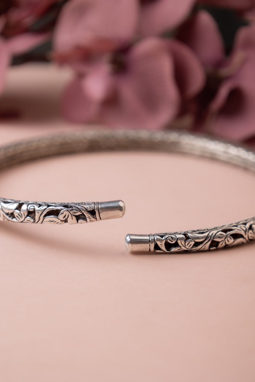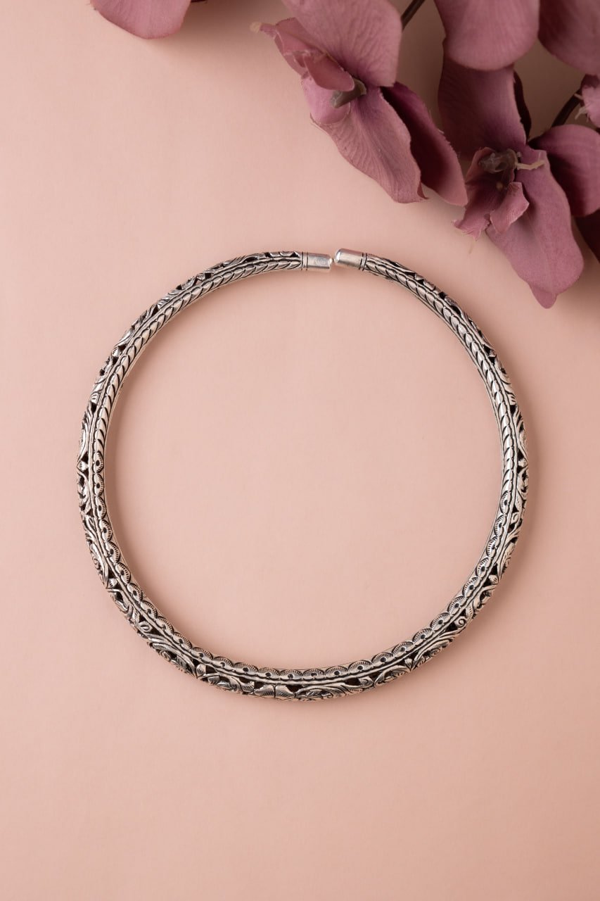 "Tattva" representing the fundamental essence of beauty, this hasli embodies the pure artistry of Indian metalwork where every petal and leaf tells a story of heritage, skill, and timeless elegance.Our exquisite Tattva hasli celebrates the ancient art of chitai carving, featuring an unbroken chain of intricate floral motifs that flow seamlessly around your neckline like a garland of silver blossoms.
