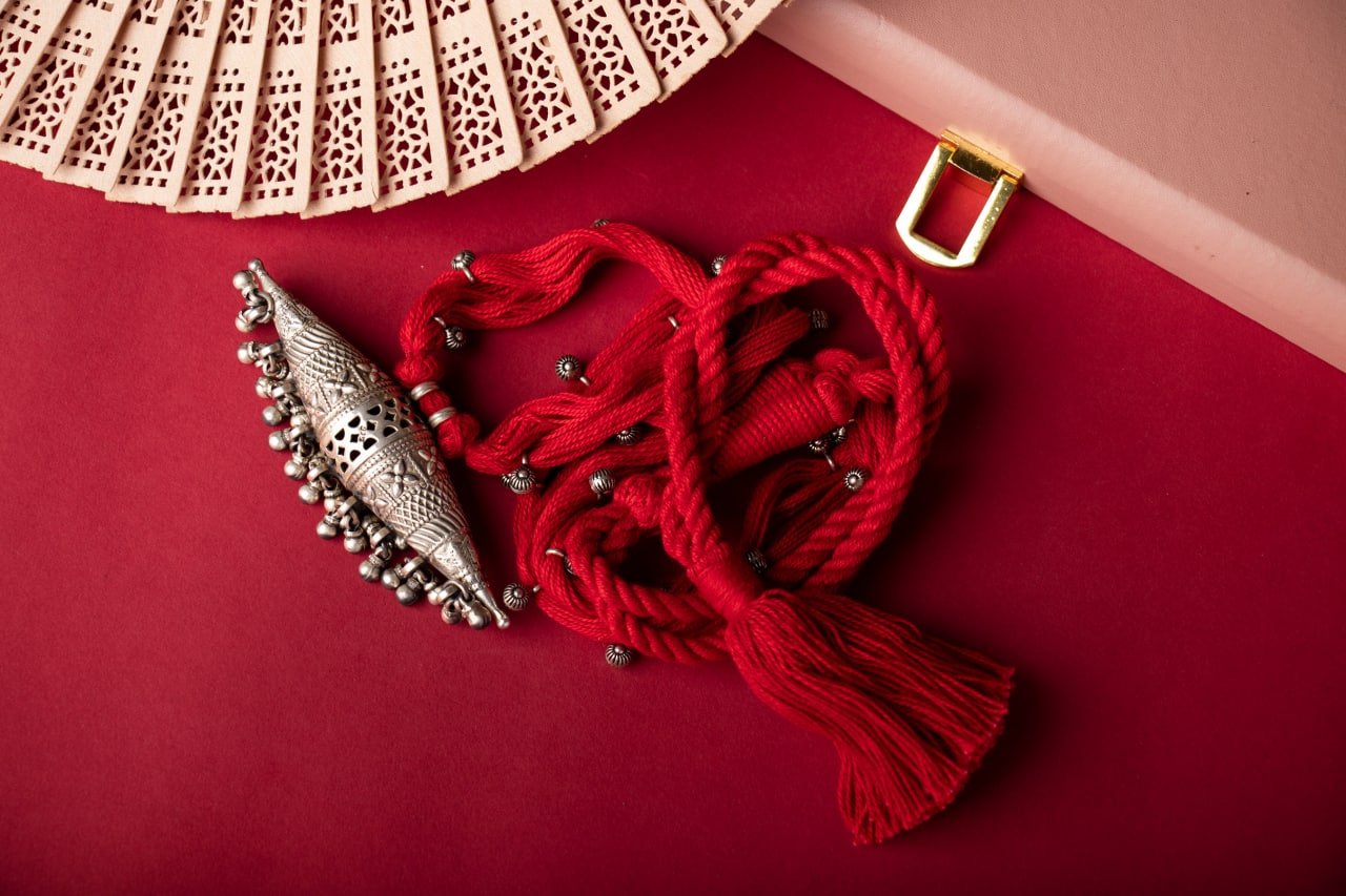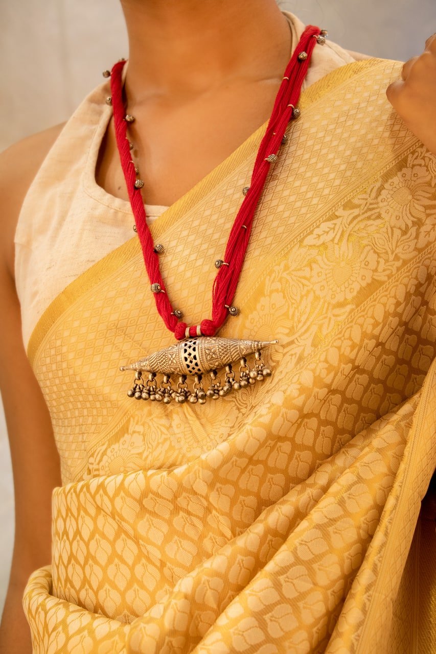 The Tattva Classic Tribal Inspired Dori Statement Necklace is a total vibe, featuring a silver pendant with intricate tribal carvings and dangling charms, paired with a bold red dori for a cultural pop. Inspired by the rhythmic beats of a tribal fest under a starlit sky, this unique piece brings a raw yet elegant charm to your style.