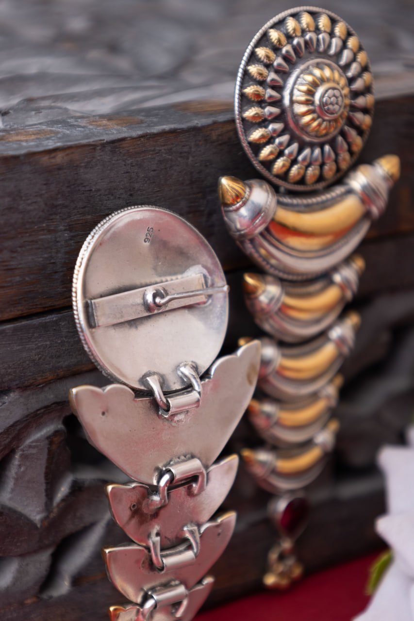 The Tattva Dual Tone Layered Statement Earring features a striking dual-tone design with layered elements and a polished silver and gold finish, crafted through masterful handcrafted techniques using 92.5 silver. Inspired by the timeless elegance of traditional Indian jewelry, each layer blends intricate artistry with enduring strength, creating a bold yet sophisticated piece.