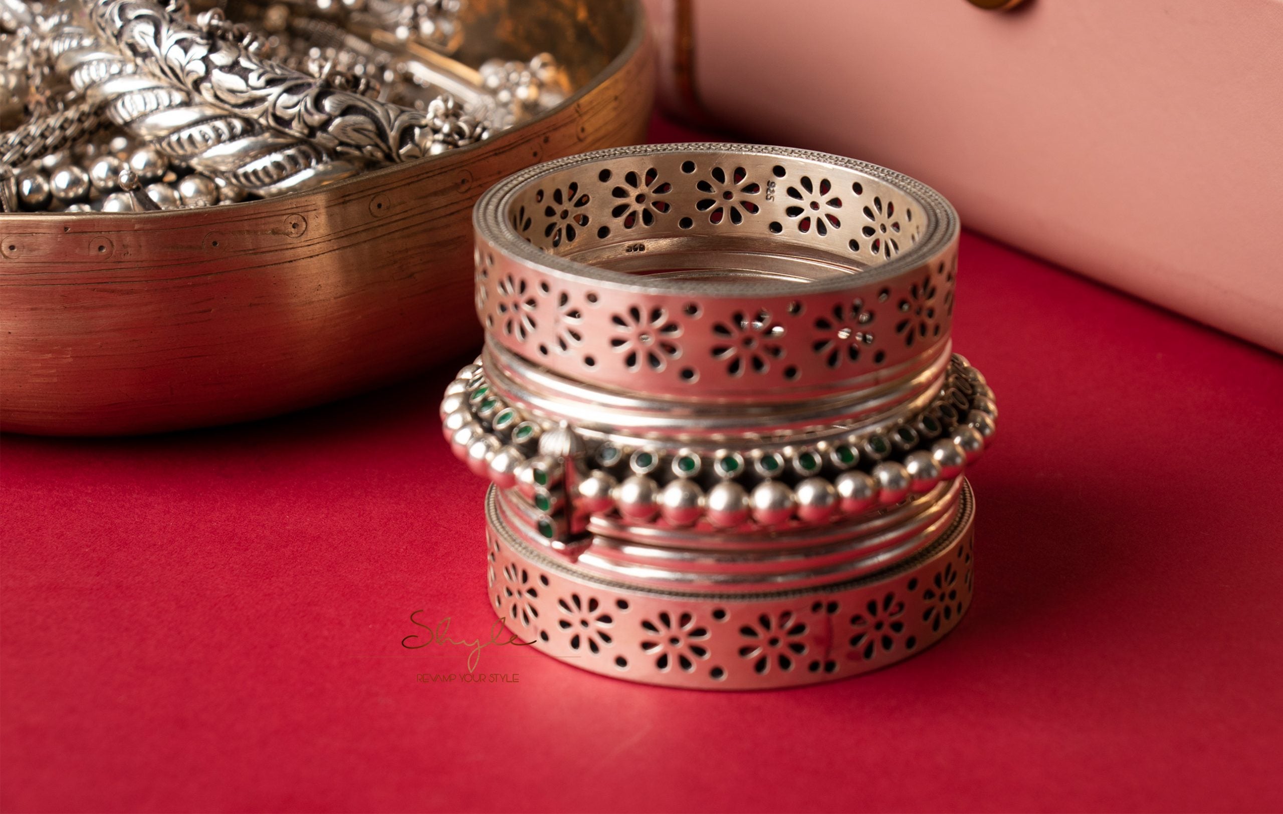 THE SHYLE TIP : Pair this bangle set with a traditional silk saree for wedding celebrations or a chic lehenga for festive occasions. Its floral design enhances both ethnic and contemporary styles. Perfect for festive and ceremonial wear.