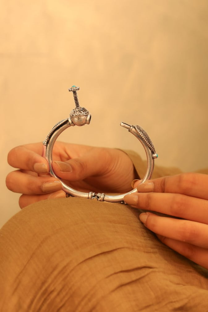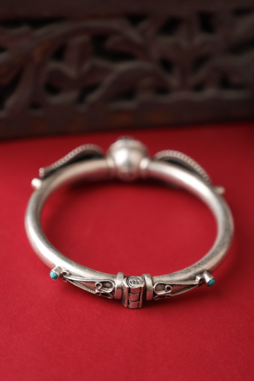 The Tattva Intricate Carry Motif Classic Turquoise Stone Kada features an intricate carry motif design adorned with vibrant turquoise gemstones, crafted through masterful handcrafted techniques using 92.5 silver. Inspired by the rich heritage of ethnic jewelry, each detailed element blends delicate artistry with enduring strength, creating a piece that feels both timeless and exquisitely modern.