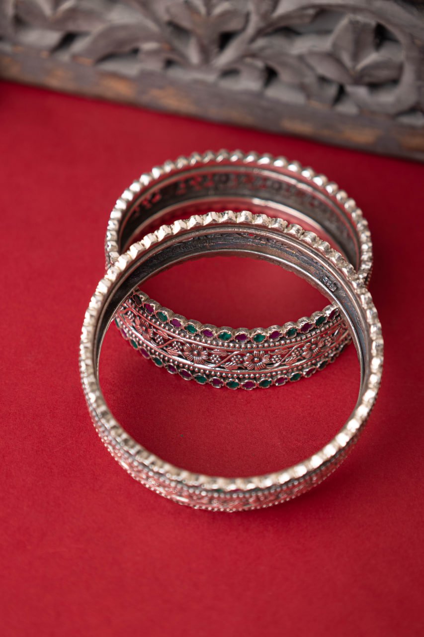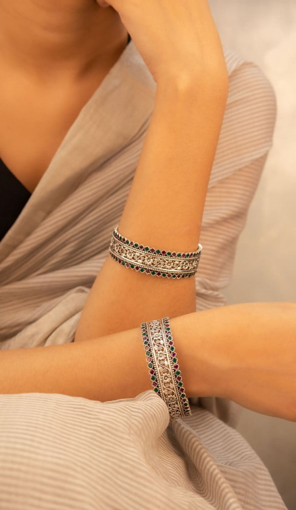 The Tattva Intricate Flora Detailed Jadau Kada features an intricate floral design with vibrant ruby and emerald gemstones, crafted through masterful jadau (inlaid) techniques using 92.5 silver. Inspired by the rich heritage of traditional Indian artistry, each detailed element blends delicate elegance with enduring strength, creating a piece that feels both timeless and exquisitely luxurious. Perfect for festive and ceremonial wear.