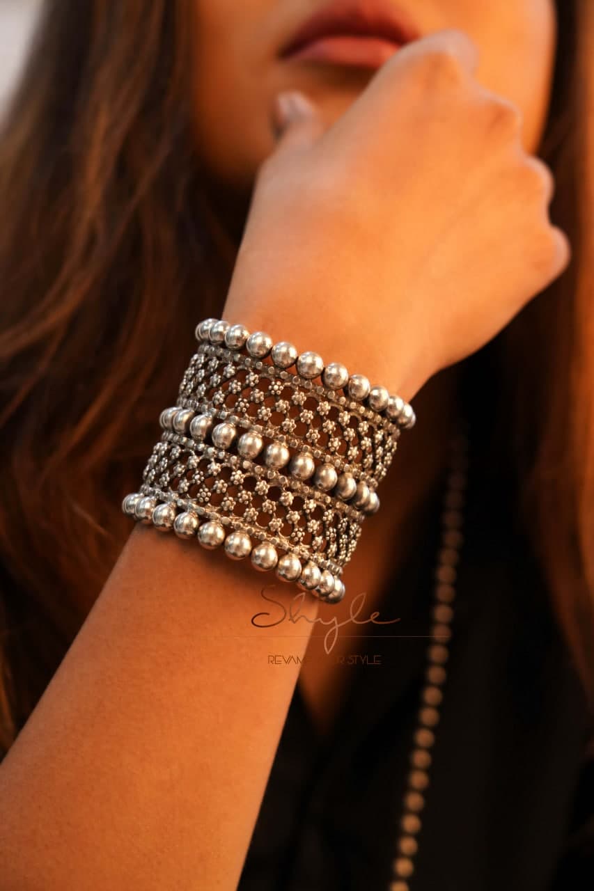 The Tattva Intricate Flower Motif Jugalbandi Ball Kada features an elaborate flower motif design combined with jugalbandi (dual) ball elements, crafted through masterful handcrafted techniques using 92.5 silver. Inspired by the timeless elegance of traditional Indian jewelry, each element blends intricate floral artistry with enduring strength, creating a piece that feels both classic and luxurious.