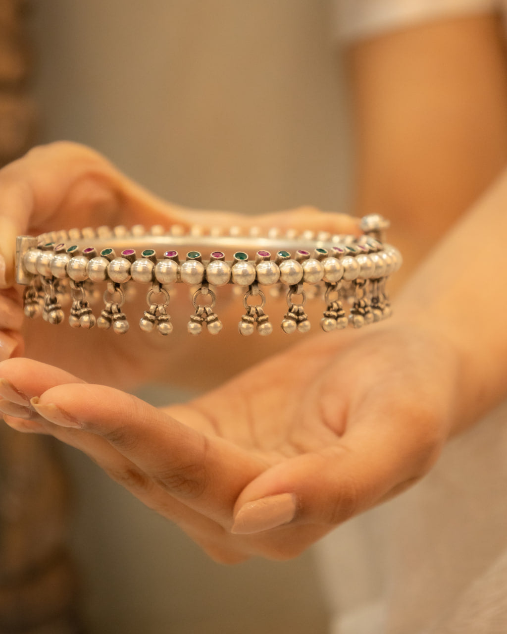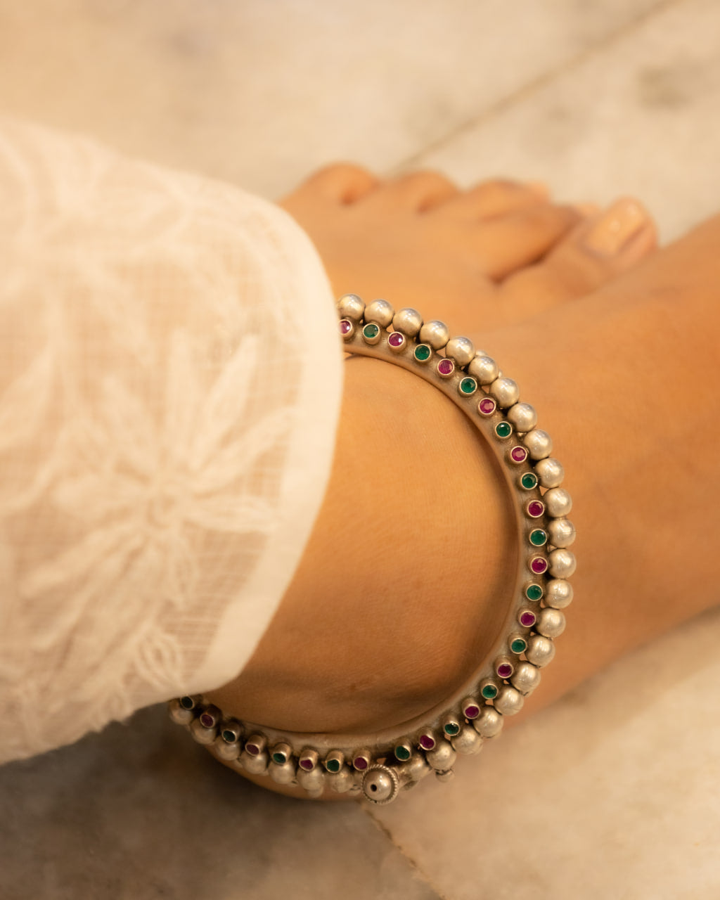 Celebrate tradition and elegance with this exquisite Tattva Jadau Ball Embossed Ghunghri Drop Ankle Kada, intricately handcrafted to perfection. The design features rows of delicate ghungroos and silver beads accented with hints of green and pink stones, creating a rhythmic harmony of colour and sound. Each detail reflects timeless craftsmanship and cultural grace, making it an heirloom-worthy piece that complements both festive and ethnic looks effortlessly.
