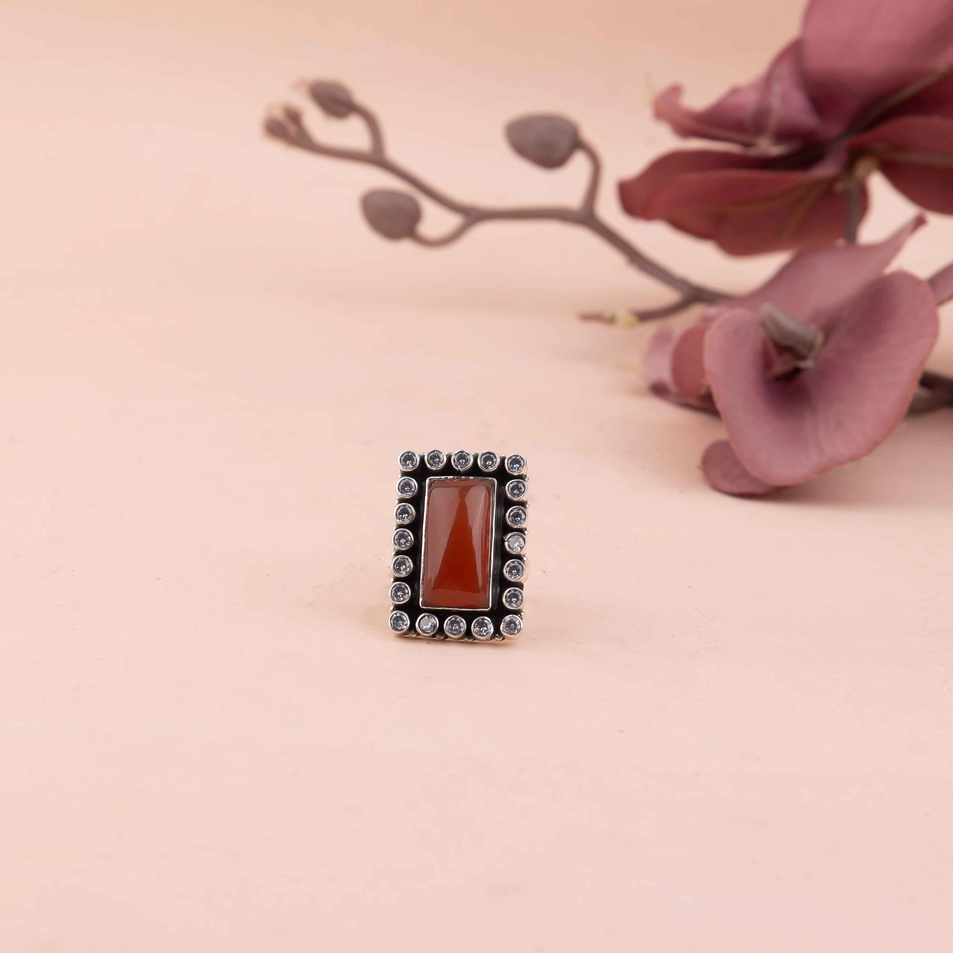 Crafted in 92.5 sterling silver with a 92.5 purity stamp, the Essence Jadau Orange Jade Cocktail Ring features a vibrant orange jade centerpiece framed by sparkling stones in a traditional jadau style. Its striking rectangular design and luxurious finish make it a standout piece for women’s fashion jewelry. Perfect for wedding jewelry and elegant accessories, this handcrafted silver ring adds a pop of color to any ensemble.