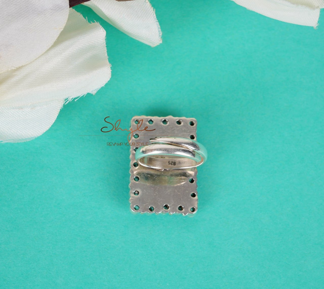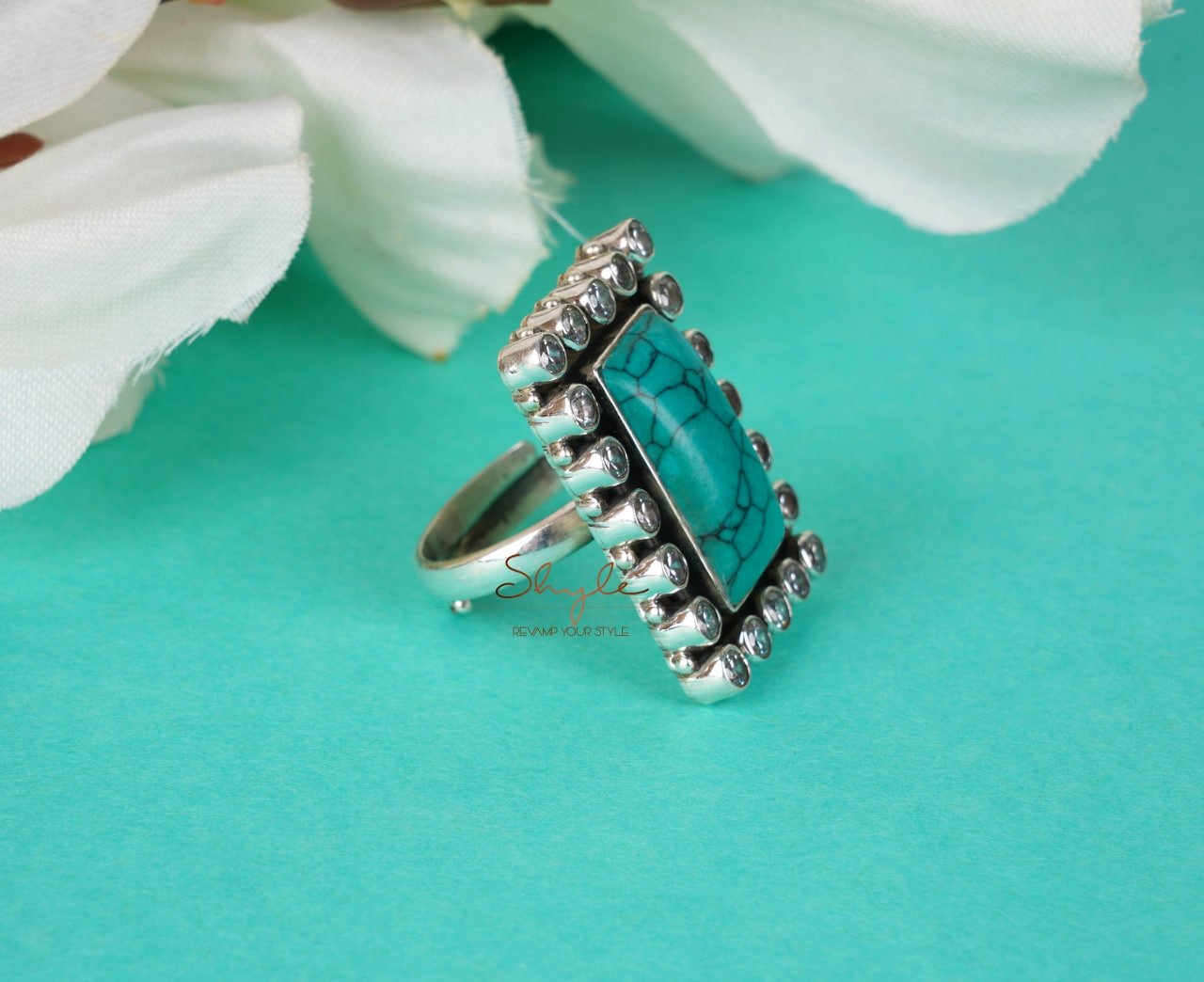 Crafted in 92.5 sterling silver with a 92.5 purity stamp, the Essence Jadau Turquoise Cocktail Ring features a striking rectangular turquoise centerpiece framed by sparkling stones in a traditional jadau style. Its bold design and glossy finish make it a standout piece for women’s fashion jewelry. Perfect for wedding jewelry, elegant accessories, and handcrafted silver rings, this premium silver ring adds a pop of color to any outfit, ideal for festive celebrations and stylish events.